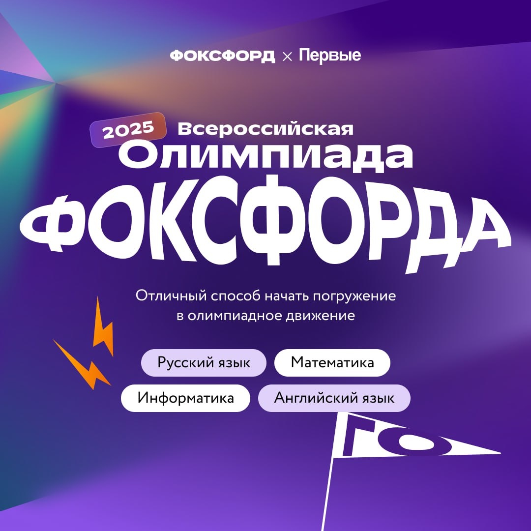 Преврати свои интересы в достижения 👀 Всероссийская онлайн-олимпиада от «Фоксфорда» стартовала — это твой шанс проявить себя, проверить знания и круто провести время. Что ждёт Первых: 🟣 1–7 классы — онлайн-тренажёры, задания в игровом формате и классные призы — брендированная продукция и билеты в кино на мультфильм «Финник»; 🟣 8–11 классы — помощь при поступлении в вуз по результатам олимпиады, финалисты встретятся 14 февраля в Москве. Учителя получат официальный сертификат организатора, а при победе благодарственные письма за вклад в успехи учеников. Участвуй, выигрывай и вдохновляй других! Подавай заявку до 14 декабря ➡️ по ссылке!