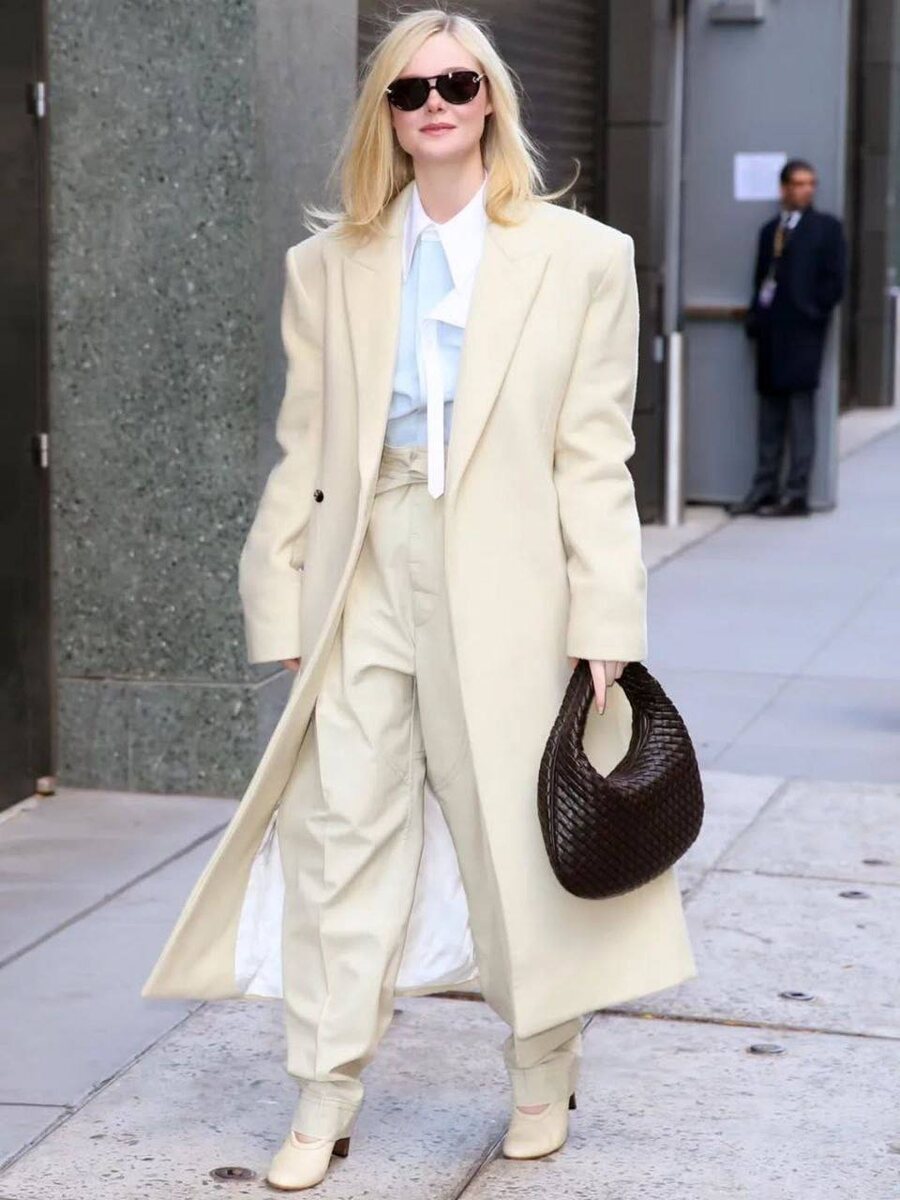 Кто сказал, что светлые оттенки нельзя носить осенью? Эль Фаннинг в тотал-луке из дебютной коллекции Луиз Троттер для Bottega Veneta опровергает это утверждение, а мы берём на заметку классный стайлинг трюк: подбирать брюки в тон к пальто.