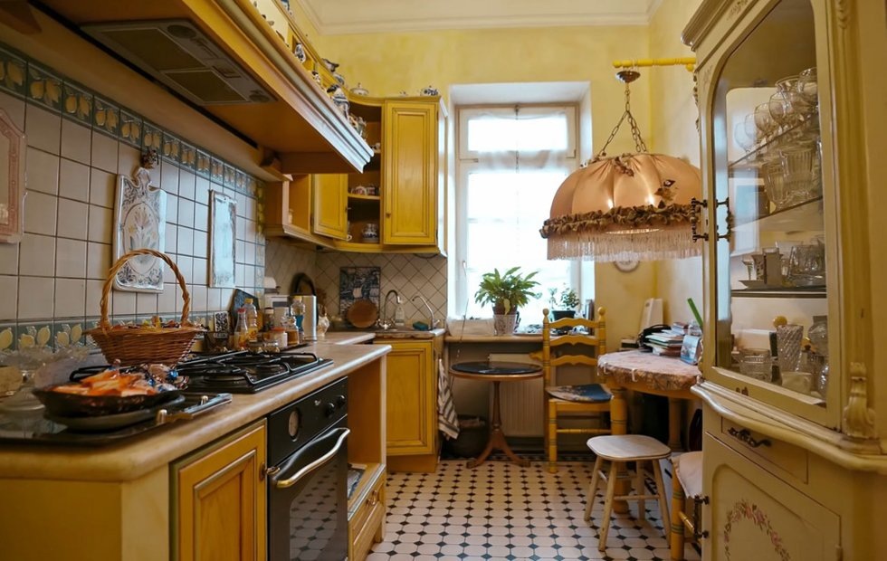 «Горку на кухне она покрасила сама — взяла кисть, краску и покрыла основным цветом, — рассказывает Ольга. — Цветочки расписывал приглашенный художник, но идея и базовый цвет — руки Людмилы Марковны. Она не боялась физической работы».