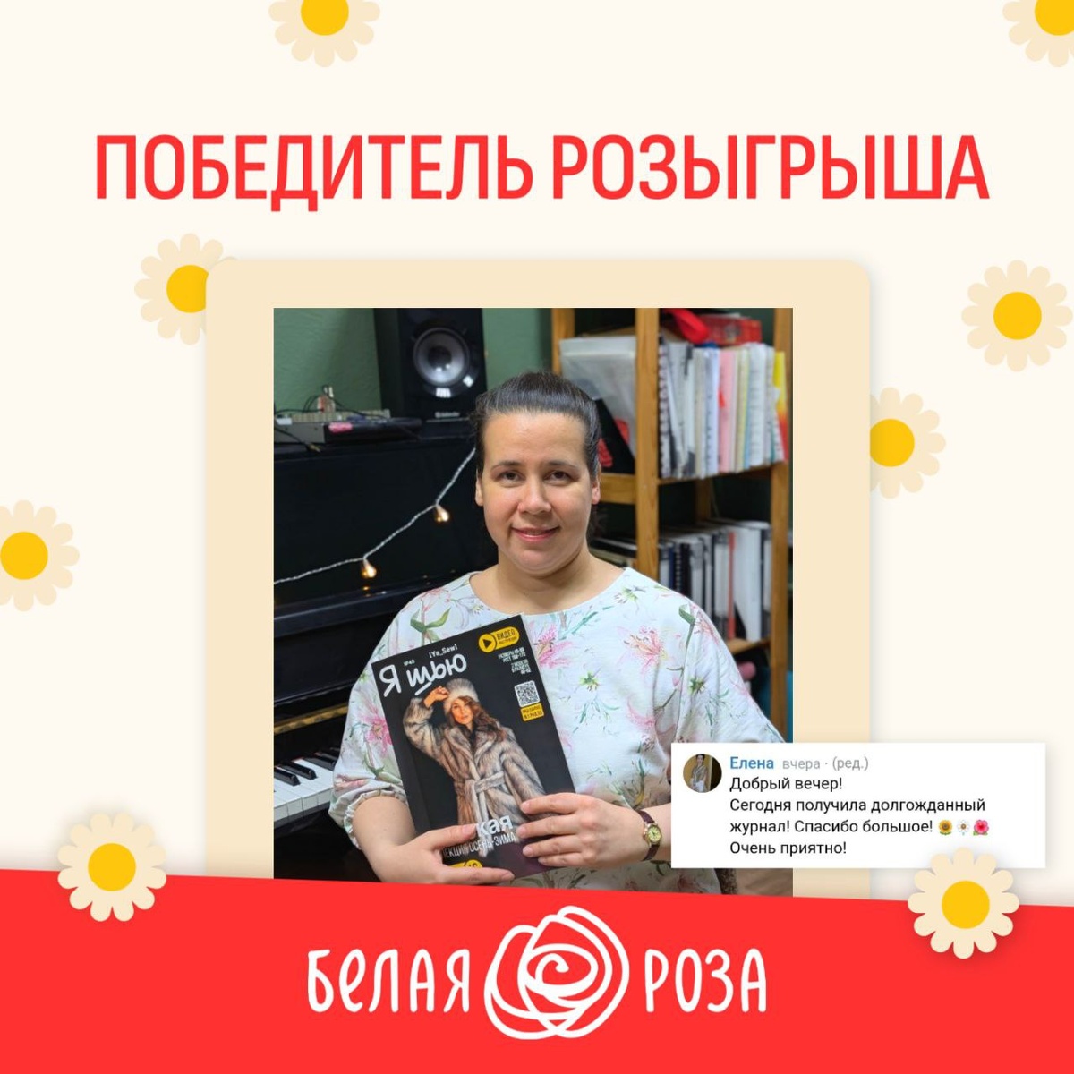 Спешим представить вам прекрасную Елену, нашу победительницу, которая стала счастливой обладательницей ценного источника вдохновения — журнала "Я шью" №48! 🎁❤️ Этот заветный выпуск совершил свое путешествие до самого Челябинска, чтобы озарить творческий путь Елены новыми идеями. От всей души поздравляем и желаем безграничного вдохновения для создания настоящих шедевров! ✨ Мы выражаем огромную благодарность всем, кто принял участие в нашем розыгрыше! Оставайтесь с "Белой Розой" – впереди вас ждет еще больше чудесных сюрпризов и выгодных предложений! 💖