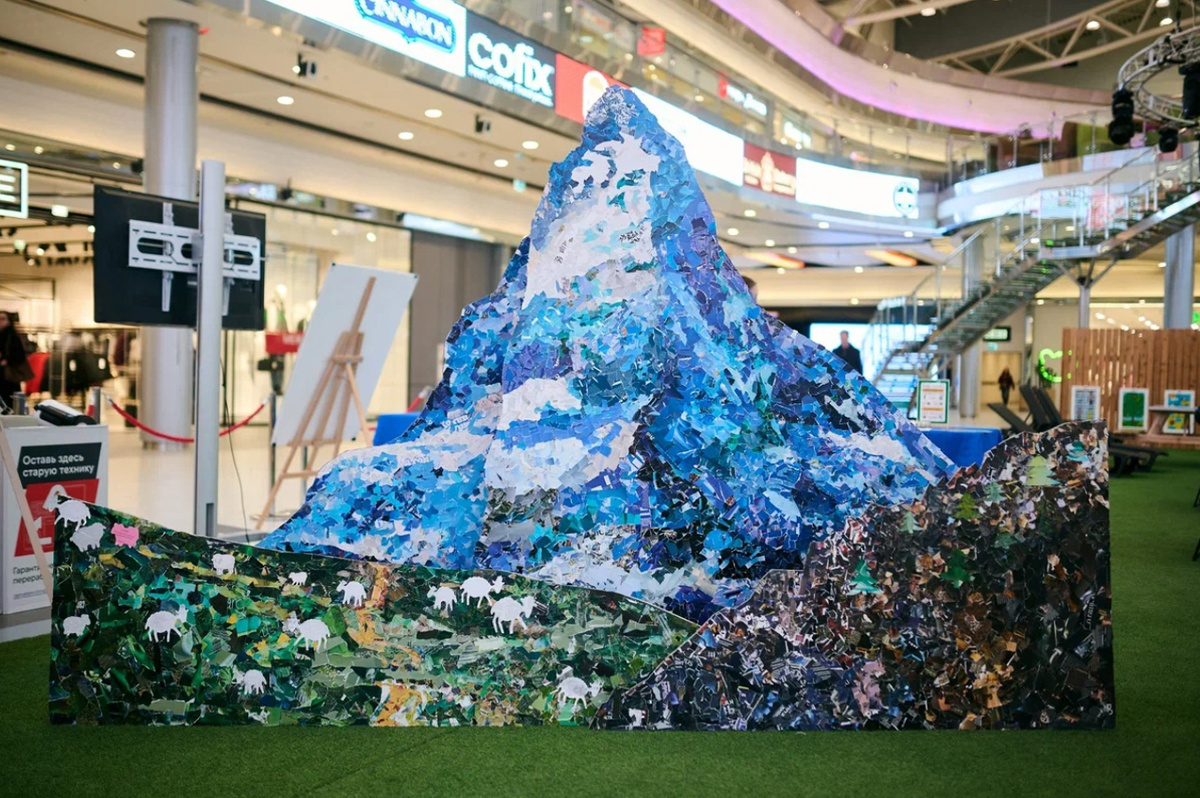 Вы наверняка видели арт-объекты из пластиковых бутылок и других отходов — часто их делают для того, чтобы привлечь внимание к мусорной проблеме. Но, к сожалению, иногда сами эти объекты в конце жизни отправляются на свалку. Особенно обидно бывает, если в качестве сырья берут легко перерабатываемые предметы (скажем, пластиковые бутылки) и заливают их таким количеством клея, что судьба у предмета одна — полигон. Каждый год «РазДельный Сбор» проводит экофестиваль в ТРК «Питер Радуга». В 2025 году мы вместе с гостями фестиваля сделали арт-объект, который привлекал внимание к проблеме изменения климата, работал как фотозона и — пригоден для переработки. Основу горы — все элементы и поддерживающие конструкции — сделали из картона, не используя плёнки и пенокартон. Найти подрядчика было непросто, но для нас было важно избежать неперерабатываемых материалов. Для коллажа взяли старые журналы, списанные из фондов библиотек и принесённые жителями. Во время фестиваля ассистент подсказывал гостям т