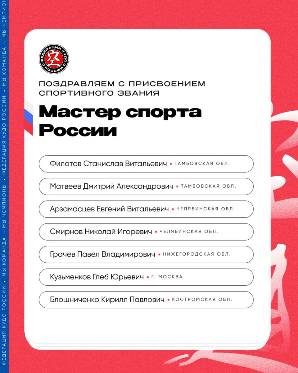 Поздравляем с присвоением спортивного звания «Мастер спорта России»!🏅 Приказами Министерства спорта Российской Федерации присвоены спортивные звания Мастеров спорта РФ спортсменам: 🥋 Филатов Станислав Витальевич Тамбовская область (приказ № 146-нг от 10.07.2025 г.) 🥋 Грачев Павел Владимирович Нижегородская область (приказ № 193-нг от 28.08.2025 г.) 🥋 Матвеев Дмитрий Александрович Тамбовская область (приказ № 209-нг от 26.09.2025 г.) 🥋 Арзамасцев Евгений Витальевич Челябинская область (приказ № 231-нг от 24.10.2025 г.) 🥋 Смирнов Николай Игоревич Челябинская область (приказ № 231-нг от 24.10.2025 г.) 🥋 Кузьменков Глеб Юрьевич г. Москва (приказ № 231-нг от 24.10.2025 г.) 🥋 Блошниченко Кирилл Павлович Костромская область (приказ № 242-нг от 24.10.2025 г.)