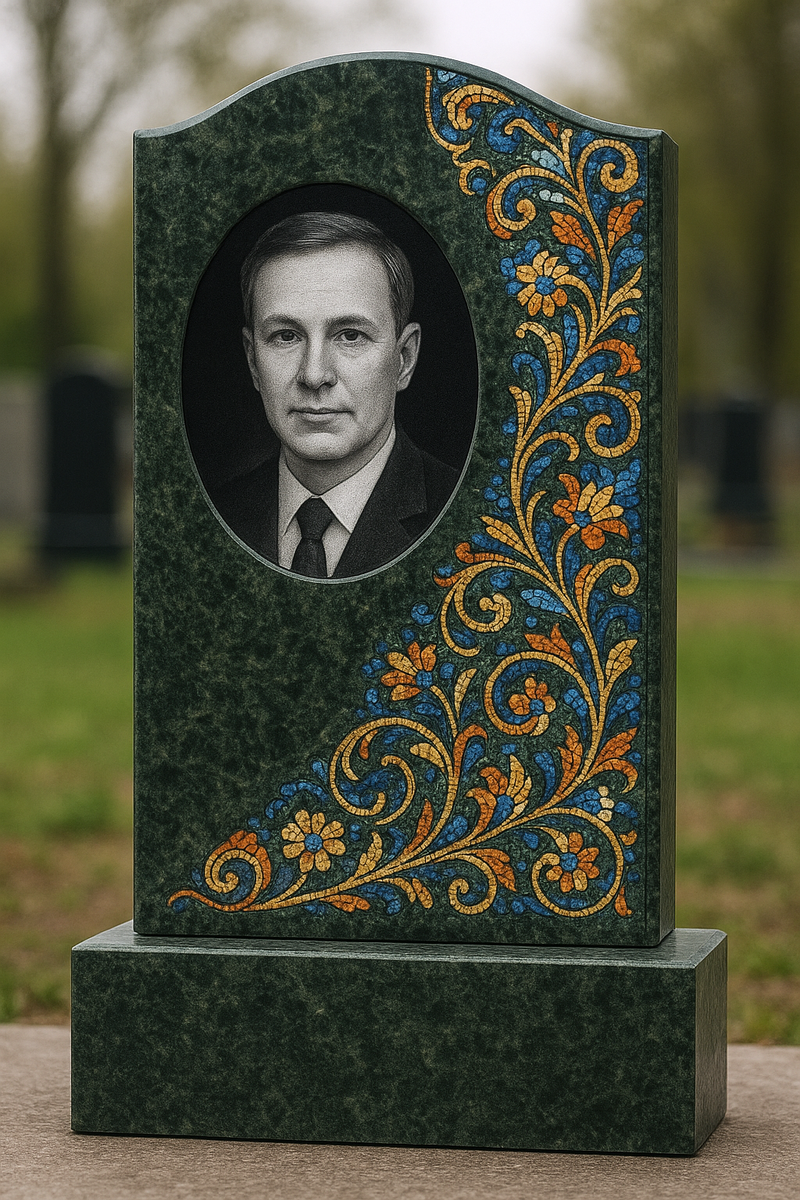 Результатом становится не просто памятник, а целостный мемориальный комплекс, где каждая деталь находится на своём месте. Мозаичный декор при этом выступает не как украшение, а как смысловой центр композиции, рассказывающий без слов историю человеческой жизни.