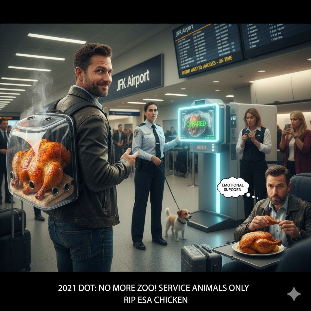 В ответ на пост 🚨 P.S. (или «Где искать курицу сегодня») 🐔🚫 ...Но, к сожалению, у этой забавной истории есть продолжение... Эпоха ESA-зоопарков закончилась. 😭 Видите ли, пока этот находчивый парень летел с жареной курицей 🍗 , другие пассажиры брали с собой... павлинов 🦚, мини-свиней 🐷 и даже хомяков на поводках. 🤦♀️ Масштаб злоупотреблений вышел из-под контроля! Авиакомпании, мягко говоря, устали от такого креатива. Чем больше креатива, тем жёстче закон! ⚖️ ❗Итог, друзья: 2021 год: минтранс США (DOT) сказал «Хватит зоопарка!» Новые правила: теперь бесплатно на борт пускают только официально обученных служебных собак (Service Animals). Никаких павлинов. 🙅♂️ Что это значит: любое другое животное теперь летит за деньги и по строгим правилам — как обычный питомец. Курице придется покупать место. 💸 Вот так массовое злоупотребление статусом ESA, символом которого стала и эта курица, навсегда изменило правила в небе. 🌍✈️ Пользуйтесь лазейками, пока они есть, но