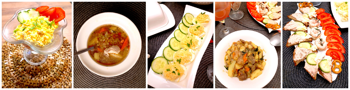 Доброе утро, день или вечер дорогие читатели!! Вчера я готовила не только блюда к обеду, но и сделала немного закусок. Хочу сказать, что для закусок не надо много времени и много продуктов, исключение мясная нарезка. Тут главное нарезать тоненько и подать на стол, единственное, что цены кусаются. А то и вовсе можно купить нарезку и разложить, вот и весь фокус.. Скажу честно, в моей семье закуску не очень -то и уважают. Сын считает, что это баловство, да и муж так говорил. Ну, а нам девочкам нравится, пусть немного, но эстетично. Мужчинам же надо поесть,, да побольше. Да и внучки больше на салаты налягают, нежели там на канапешки, эклерчики и тарталетки едят с чем либо , куснут и всё. А вот салаты новогодние с удовольствием, это же другое дело!.. Но я вот что приготовила. Прошу к столу! Вот что я вчера приготовила в обычный будний день. Сначала был у меня готов суп на курином бульоне с гречкой. На второе я картошечку потушила с куриной печенью. Сделала порционный коктейл