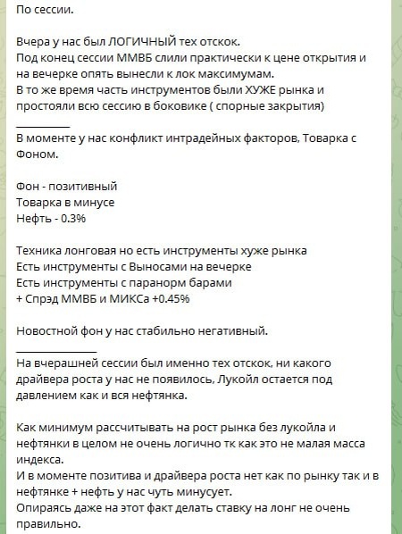 🆘В рамках обучения смотрим обзор. Это ежедневный обзор который выходит в закрытом ТГ канале ДО начала сессии. ❗️План на день, ШОРТ, опираясь на текущий негатив в нефтянке и в частности в Лукойле. + скрин с планом на день. ПОЧИТАЙТЕ!!! ____________ ❗️Итог, логика оказалась верной на 100% Сделки закрыли по 1м целям опираясь на стандартный АТР по ММВБ _________ ЮТУБ👉https://youtu.be/XHxc1JM_l4U ВК👉https://vk.com/wall-210912207_5198 ____ 🆘СМОТРИ ОБЗОРЫ!!! Хочешь ежедневно получать такую информацию до начала ОС?? Присоединяйся!!! ТГ канал @LaktionovPrivat_bot - Подписка отбивается за одну сделку!