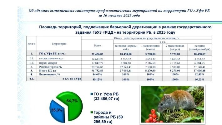 Специалисты наблюдают снижение среднемноголетнего уровня заболеваемости. В Уфе продолжается осенняя дератизационная обработка от грызунов, работы планируют завершить до 30 ноября. Об этом на оперативном совещании в мэрии города рассказал главный врач Республиканского центра дезинфекции Павел Мочалкин. Специалист выступил с докладом о выполненных санитарно-профилактических мероприятиях, в том числе дератизации, дезинсекции открытых территорий от клещей и летающих кровососущих насекомых, ларвицидной обработке водоёмов. По его словам, всего за десять месяцев в городе поэтапно обработано 29 тысяч гектаров территорий. Эпидемиологическая эффективность от такого рода работ выражена в виде снижения среднемноголетнего уровня заболеваемости, например, геморрагической лихорадкой. Здесь речь идёт о 700 случаев в год. Павел Мочалкин напомнил, что комплексные затраты на одного больного составляют порядка 120 тысяч рублей. Профилактические работы позволяют предотвратить расходы на сумму более 80 млн