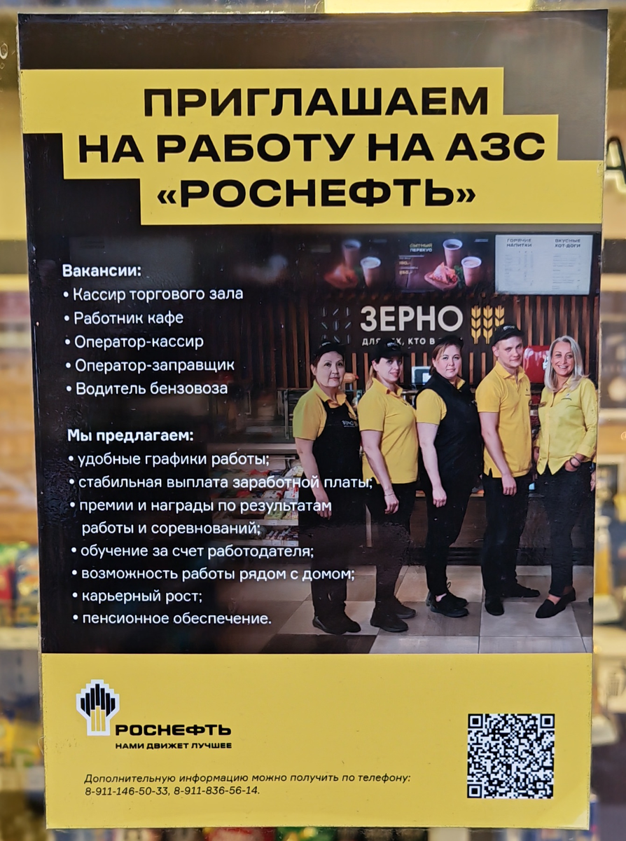 Заправлялся сейчас на «Роснефти», сфотографировал объявление о найме. Можно было ещё на «Лукойл» поехать, он даже чуть ближе был, но я предпочитаю «Татнефть», «Газпром нефть» и «Роснефть», так как я их акционер. Акции «Лукойла» надо бы тоже в портфель положить, для коллекции, но денег жалко: в светлое будущее этой компании я верю не на 100%.