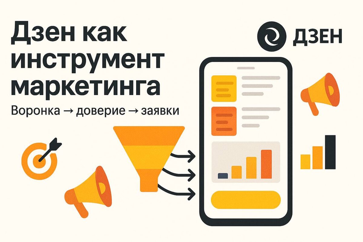 Яндекс Дзен как инструмент маркетинга: что дает бизнесу и как запустить Дзен — это рекомендательная лента, где алгоритм сам приводит вам аудиторию по интересам. Если правильно выстроить контент-воронку, Дзен решает четыре задачи: узнаваемость, лиды, прогрев и повторные продажи. Как работает для бизнеса • ТОП воронки (узнаваемость): простые разборы боли клиента, сравнения «А vs Б», тренды ниши. • Середина (доверие): инструкции, чек-листы, кейсы «было/стало», калькуляторы, мини-аудиты. • Низ (конверсия): условия, цены, сроки, гарантии, ответы на возражения + призыв к действию. Форматы, которые чаще дают охваты и заявки • Кейс на 800–1500 знаков с цифрами. • «Разбор ошибки» в 5–7 тезисов. • «Выбор без боли»: таблица/карусель критериев. • Короткое видео/гиф-гайд. В каждом — один CTA: скачать шаблон, пройти квиз, написать в бота. Ссылки с UTM. Продакшн и регулярность • 3–5 публикаций в неделю, 3 ядра тем: «боли», «решения», «кейсы». • Контент-банк на 30 идей: 10 вопросов клиента, 10 воз