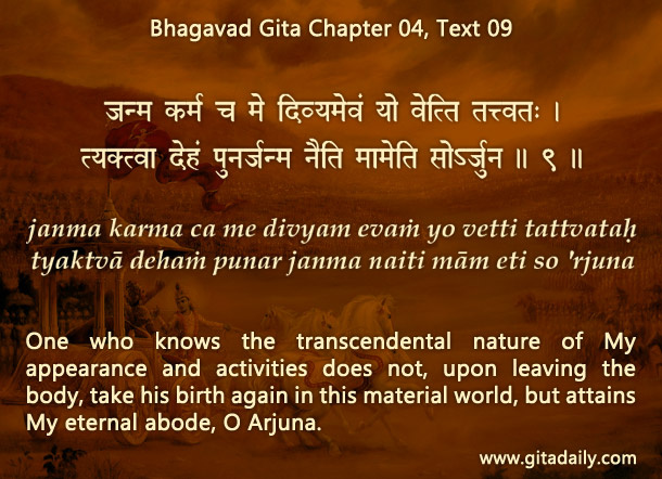 «Тот, кто в истине познаёт трансцендентальную природу Моего рождения и деяний, покинув тело, не рождается вновь, но достигает Меня, о Арджуна».