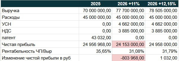 ΠΏΡΠΈΠ±ΡΠ»Ρ Π±ΡΠ΄Π΅Ρ Π½ΠΈΠΆΠ΅! -βΠ½Π°Π»ΠΎΠ³ΠΈ Π²ΡΡΠ°ΡΡΡΡ Π½Π° 11%? ΠΠΎΡ ΡΠ°ΡΡΡΡΡ Π΄Π»Ρ Π²Π°ΡΠ΅Π³ΠΎ Π±ΠΈΠ·Π½Π΅ΡΠ°, ΠΈ Π²ΠΎΡ ΡΡΠΎ ΠΏΠΎΠ»ΡΡΠΈΠ»ΠΎΡΡ: Π 2025 Π³ΠΎΠ΄Ρ (ΠΠ°ΡΠ΅Π½Ρ): π ΠΡΡΡΡΠΊΠ°: 70 ΠΌΠ»Π½ ΡΡΠ±. π’ Π§ΠΈΡΡΠ°Ρ ΠΏΡΠΈΠ±ΡΠ»Ρ: ~25 ΠΌΠ»Π½ ΡΡΠ±. π Π Π΅Π½ΡΠ°Π±Π΅Π»ΡΠ½ΠΎΡΡΡ: 35,65% Π 2026 Π³ΠΎΠ΄Ρ (Π£Π‘Π 6% + ΠΠΠ‘ 5%): π ΠΡΠ»ΠΈ ΠΏΡΠΎΡΡΠΎ ΠΏΠΎΠ΄Π½ΡΡΡ ΡΠ΅Π½Ρ Π½Π° 11%, ΡΠΎ: ΠΡΡΡΡΠΊΠ° Π²ΡΡΠ°ΡΡΠ΅Ρ Π΄ΠΎ 77,7 ΠΌΠ»Π½ ΡΡΠ±. βΌοΈ ΠΠΎ ΡΠΈΡΡΠ°Ρ ΠΏΡΠΈΠ±ΡΠ»Ρβ¦ ΡΠΏΠ°Π΄Π΅Ρ Π΄ΠΎ ~24,15 ΠΌΠ»Π½ ΡΡΠ±. π± Π Π΅Π½ΡΠ°Π±Π΅Π»ΡΠ½ΠΎΡΡΡ ΡΠ½ΠΈΠ·ΠΈΡΡΡ Π΄ΠΎ 31,08% π ΠΡΠΎΠ³: ΠΌΠΈΠ½ΡΡ 804 ΡΡΡ. ΡΡΠ±. ΡΠΈΡΡΠΎΠΉ ΠΏΡΠΈΠ±ΡΠ»ΠΈ, Π½Π΅ΡΠΌΠΎΡΡΡ Π½Π° ΡΠΎΡΡ Π²ΡΡΡΡΠΊΠΈ! βΠΠΎΡΠ΅ΠΌΡ ΡΠ°ΠΊ Π²ΡΡΠ»ΠΎ? ΠΡΠΎΡΡΠΎΠ΅ ΠΏΠΎΠ²ΡΡΠ΅Π½ΠΈΠ΅ ΡΠ΅Π½ Π½Π° 11% Π½Π΅ ΠΏΠΎΠΊΡΡΠ²Π°Π΅Ρ Π²ΠΎΠ·ΡΠΎΡΡΡΡ Π½Π°Π»ΠΎΠ³ΠΎΠ²ΡΡ Π½Π°Π³ΡΡΠ·ΠΊΡ. Π Π°Π½ΡΡΠ΅ ΠΌΡ ΠΏΠ»Π°ΡΠΈΠ»ΠΈ Π»ΠΈΡΡ ΡΠΈΠΊΡΠΈΡΠΎΠ²Π°Π½Π½ΡΡ ΡΡΠΌΠΌΡ Π·Π° ΠΏΠ°ΡΠ΅Π½Ρ, Π° ΡΠ΅ΠΏΠ΅ΡΡ β ΠΏΡΠΎΡΠ΅Π½Ρ Ρ ΠΎΠ±ΠΎΡΠΎΡΠ° ΠΈ Π΄ΠΎΠ±Π°Π²Π»Π΅Π½Π½ΠΎΠΉ ΡΡΠΎΠΈΠΌΠΎΡΡΠΈ. Π§ΡΠΎ ΠΆΠ΅ Π΄Π΅Π»Π°ΡΡ? Π Π°ΡΡΠ΅ΡΡ ΠΏΠΎΠΊΠ°Π·ΡΠ²Π°ΡΡ, ΡΡΠΎ Π΄Π»Ρ ΡΠΎΡ