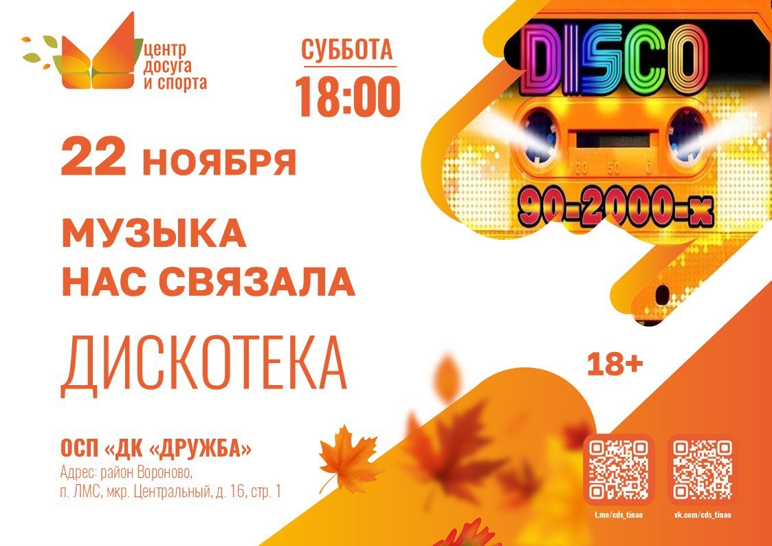 🎧📼 «Музыка нас связала» : Самая ностальгическая дискотека! 📼🎧 Готовы вернуться во времена кассет, ярких лосин и первых хитов? Приглашаем всех, кто помнит золотую эпоху, на зажигательную танцевальную программу «Музыка нас связала»! Вместе мы вспомним самые горячие Хиты 90-х и 2000-х! Вас ждет чистая ностальгия, безудержные танцы и море позитива! Приходите, чтобы оторваться под любимые треки и встретить старых друзей! 🔥 ВХОД СВОБОДНЫЙ! 🔥 🗓️ Когда: 22 НОЯБРЯ, СУББОТА ⏰ Время: 18:00 📍 Где: ОСП «ДК «ДРУЖБА» Адрес: район Вороново, п. ЛМС, мкр. Центральный, д. 16, стр. 1 🔞 Возраст: 18+ Не пропустите главный танцевальный вечер осени! #новостивороново #анонсывороново #новоститинао #анонсытинао