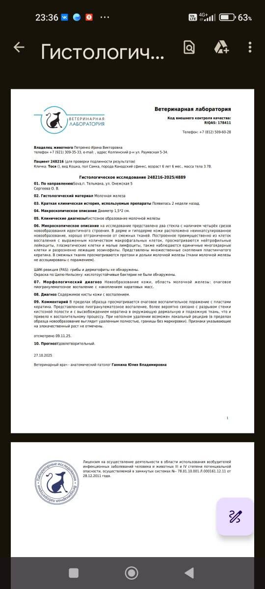 У нас хорошие новости про кошечку Тося! Пришла гистология - это не онкология🙏