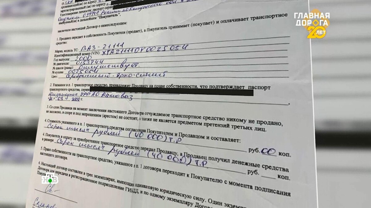 [ Смотреть видео на сайте НТВ ] Договор купли-продажи машины — это не точка, а запятая. Новый собственник может нарушать сколько угодно за счет бывшего владельца. Так произошло в Подмосковье, где доставщик нарушил на миллион рублей, а счета арестовали у прошлой хозяйки автомобиля. Шесть лет назад муж Ольги Скляровой продал автомобиль своему знакомому. На себя новый владелец машину не оформил, потом муж умер, а номер телефона покупателя не сохранился. Ольга уже и забыла, что у нее был такой автомобиль, но ей напомнили приставы. Ольга Склярова: «В день бывает по пять штрафов, бывает по восемь штрафов, бывает по три штрафа. Очень редкие дни, когда ничего не приходит». Чтобы снять машину с учета, нужно оплатить почти 1200 постановлений более чем на миллион рублей. У нынешнего владельца машины — злостного нарушителя правил дорожного движения, как выяснилось, нет ни договора купли-продажи, ни страховки. Но забрать у него машину или заставить оплачивать штрафы по закону не получится. Документ