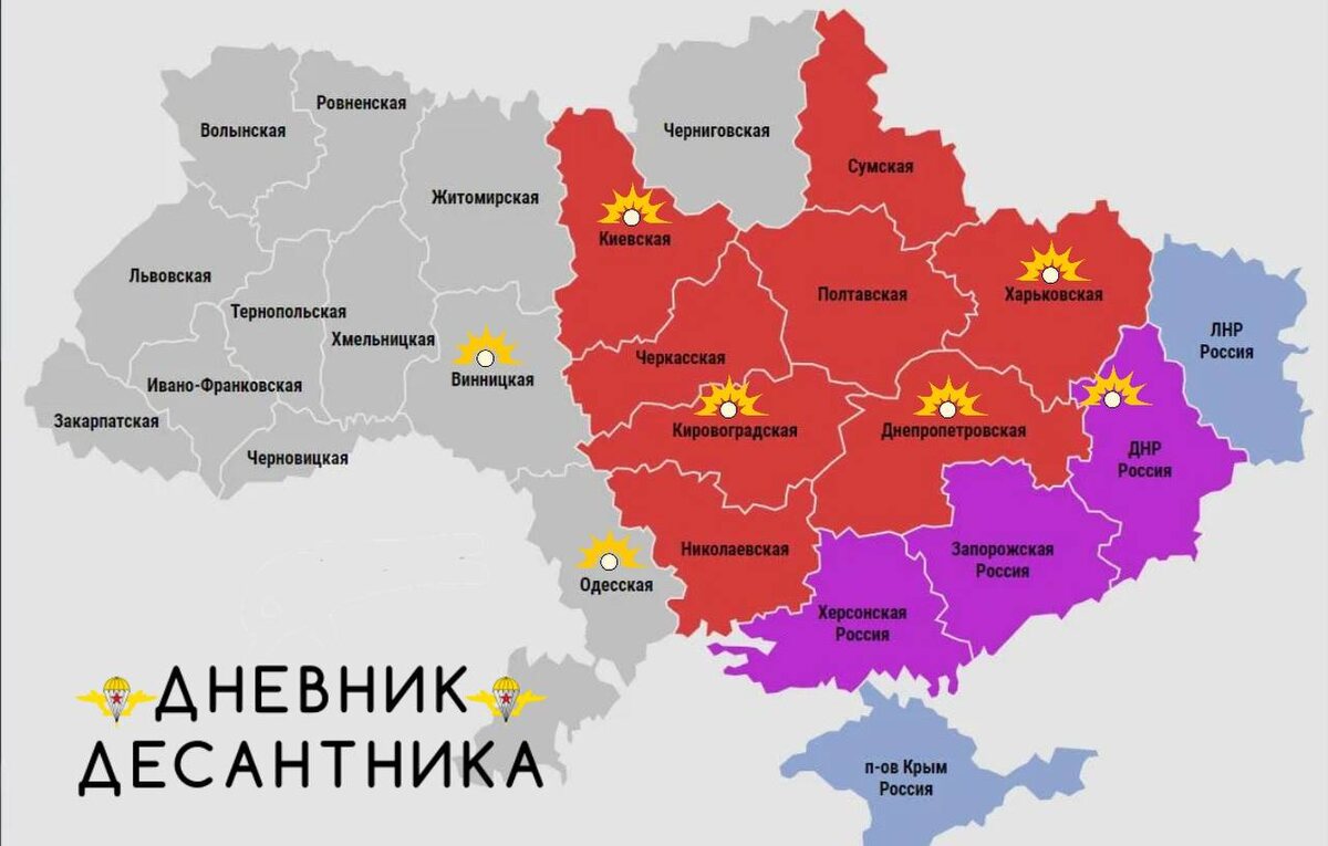 🪂 Ночные удары по территории врага. Прошедшей ночью ВС РФ провели масштабную атаку дронами. В воздушном пространстве Украины было зафиксировано около 200 дронов "Герань" и "Гербера", которые поразили цели в следующих областях: 💥Краматорск, ДНР. Цель- энергетическая инфраструктура. 💥Богуслав, Киевская область удар также по энергетической инфраструктуре. 💥Ладыжин, Винницкая область. Объект для поражения- тепловая электростанция. 💥Лозовая, Харьковская область. Цель- железнодорожная станция. 💥Васильковка, Чаплино, Днепропетровская область. Поражена железнодорожная инфраструктура. 💥Березовка, Одесская область. Цель - энергетическая инфраструктура. 💥Дополнительно прилеты по Долинской, Кировоградская область, Кировограду, Одессе, Виннице, Павлограду. ▫️ Дневник Десантника 📲 Дневник Десантника в МАХ