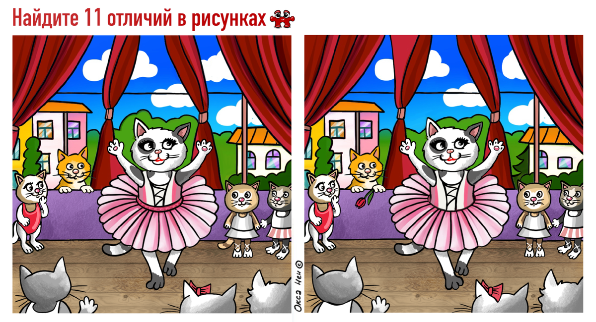 Всем привет! Сегодня в международный день балета рыжий котик пришел с поздравлениями в танцевальную школу к своей подруге-балерине. Пока Кеша приобщается к прекрасному, можно поискать 11 отличий на картинках.