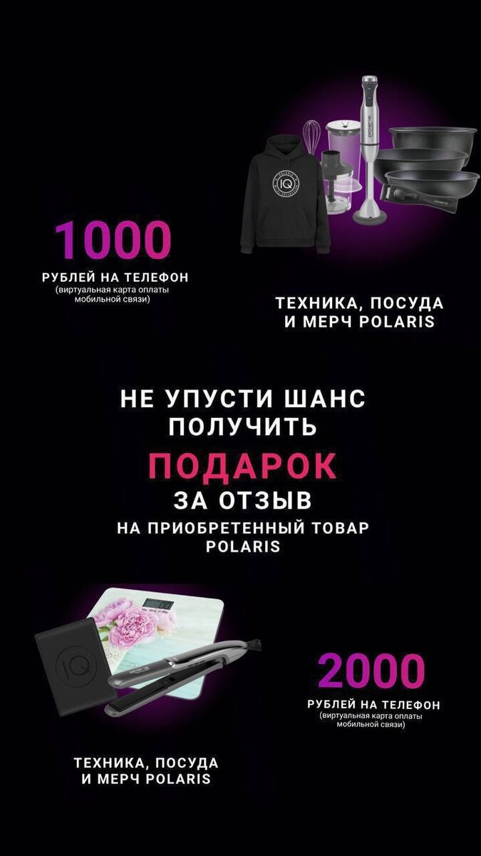 0️⃣0️⃣0️⃣0️⃣0️⃣0️⃣0️⃣0️⃣ Акция Polaris «Подарок за отзыв!» 🔴от 500₽ до 4000₽ на мобильный телефон 🔴стайлер, педикюрный набор, кухонные весы, посуда, техника и многое другое Как получить приз? 👇 🔺 НАПИШИ ОБЪЕКТИВНЫЙ И РАЗВЕРНУТЫЙ ОТЗЫВ, о приобретенном товаре, опубликуй его на сайте магазина, где была совершена покупка. 🔺 После публикации — ЗАПОЛНИ НЕБОЛЬШУЮ АНКЕТУ на этом сайте, прикрепи скриншот отзыва и ссылку на него, а также фото чека и серийного номера прибора. 🔺 ОЖИДАЙ СВОЙ ПОДАРОК. Мы бесплатно отправим его в любой город России. Подробности 👇 🟠Написать отзыв можно на ЛЮБОЙ товар купленный в период с 1.09.2020 по 31.12.2030 (может у вас дома уже есть техника этой фирмы и осталось только написать отзыв?😉) 🟠Полные правила акции 👉ТУТ ✅ Подписаться 🔣 Бот с промокодами