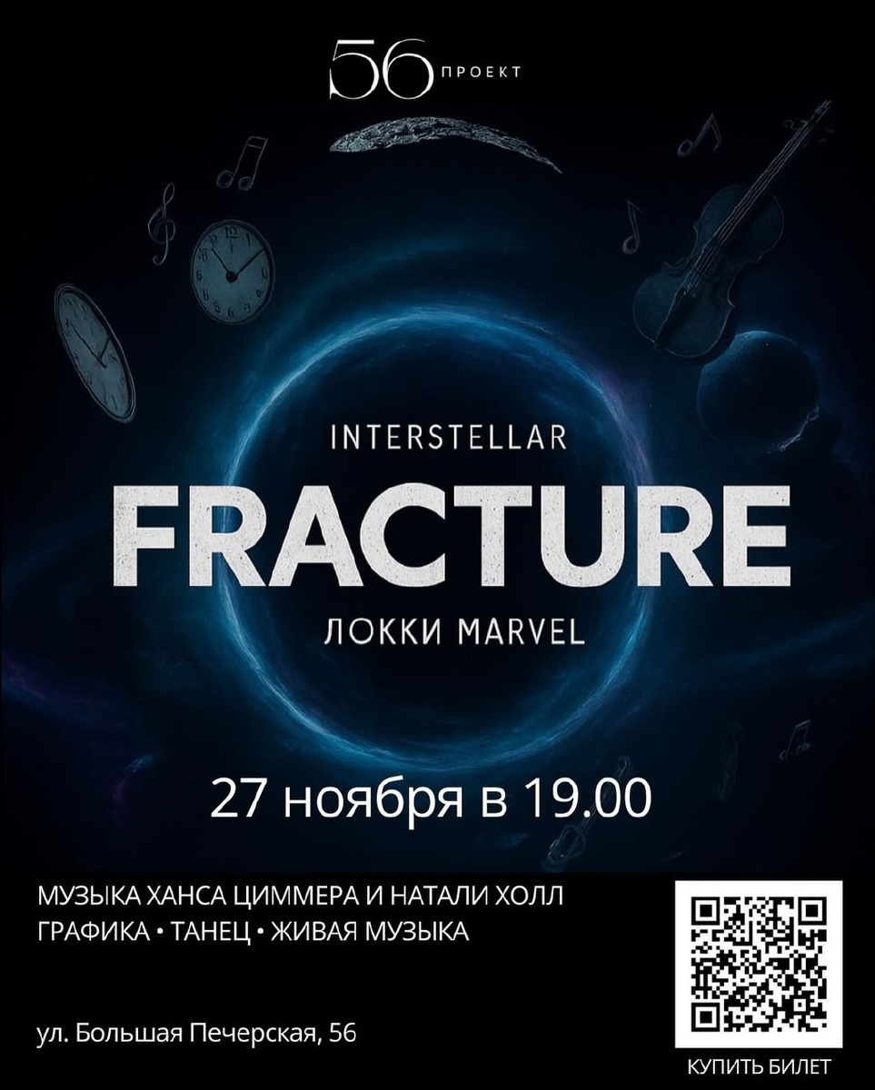 FR̸A̸C̸T̸U̸R̸E̸: Интерстеллар + Локи Новая хореография Вселенной ⠀ Когда время теряет прямолинейность, начинается танец бесконечности. Музыка Ханса Циммера, вибрации мультивселенной и пластика тела сливаются в одно. ⠀ «Fracture» не шоу. Это разлом между измерениями и жанрами. ⠀ 🌀 Interstellar и Loki в живом исполнении 🌀 Современная хореография и визуальное искусство 🌀 Новый опыт времени, движения и восприятия ⠀ 27 ноября в 19:00 (сбор гостей с 18:30) ул. Большая Печерская, 56 ⠀ 😄 Мероприятия Нижний Новгород. Я местный! 📱 Telegram | 📱 MAX