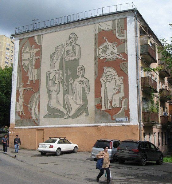 Сграффито в посёлке Пироговский , Мытищи. В 1960-х годах, на торце исторического здания бывшей казармы работников ткацкой фабрики товарищества «Пелагея Чернышева и сыновья», после революции ставшей фабрика «Пролетарская победа», в лучших традициях советской монументальной живописи, было создано панно. Для создания панно высотой в три этажа использовали технику сграффито, от итальянского «sgraffito» выцарапанный. Это техника декорирования, при которой на стену наносят несколько слоев разноцветной штукатурки, а затем процарапывают верхний слой для создания рисунка или орнамента. Самое привлекательное в этой технике, помимо ее исключительной красоты и прочности, простота исполнения. Материал наносят на стену или любую другую поверхность, а затем соскребают в некоторых местах так, чтобы был виден первый слой и вырисовывался рисунок. В XV-XVII веках способ сграффито широко применяли в Италии для украшения наружных стен архитектурных сооружений. Благодаря сравнительной простоте технических