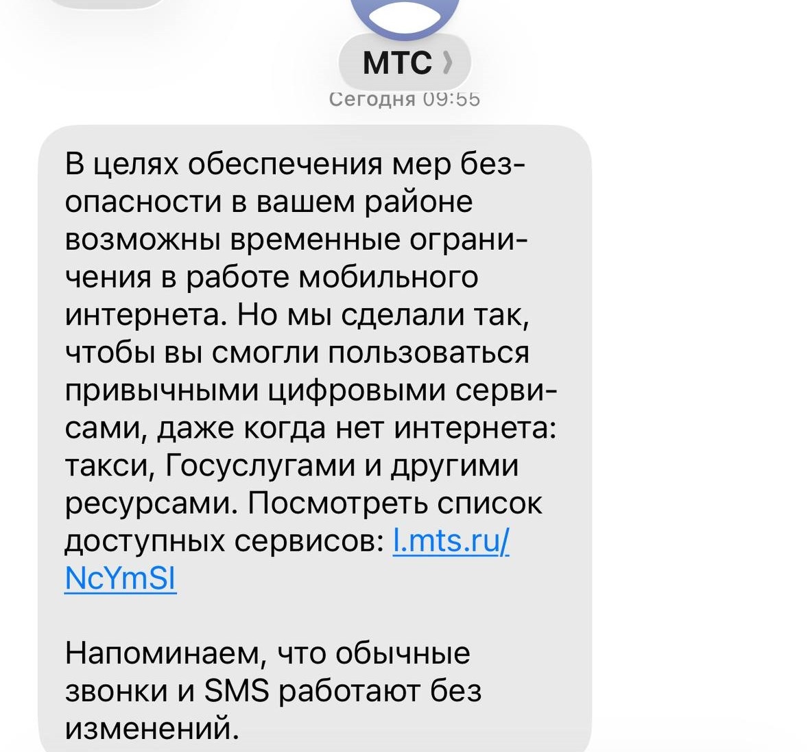 Екатеринбург, 12 ноября — ИА Время Пресс. Мобильный интернет официально начали ограничивать в Свердловской области. Жители Среднего Урала массово стали получать смс-сообщения от операторов сотовой связи. Первым об ограничениях сообщил оператор МТС. Утром в среду, 12 ноября свердловчане получили смс-рассылку, в которой говорится, что в целях обеспечения безопасности в некоторых районах возможны ограничения. «В целях обеспечения мер без-опасности в вашем районе возможны временные ограничения в работе мобильного интернета. Но мы сделали так, чтобы вы смогли пользоваться привычными цифровыми серви-сами, даже когда нет интернета: такси, Госуслугами и другими ресурсами. Посмотреть список доступных сервисов [можно на сайте]. Напоминаем, что обычные звонки и SMS работают без изменений», — говорится в рассылке. Скриншот: ИА «Время Пресс» В минувшие выходные похожую рассылку получили абоненты «Билайна» и Tele 2. Ранее в России ввели «период охлаждения» для сим-карт граждан, которые вернулись из-
