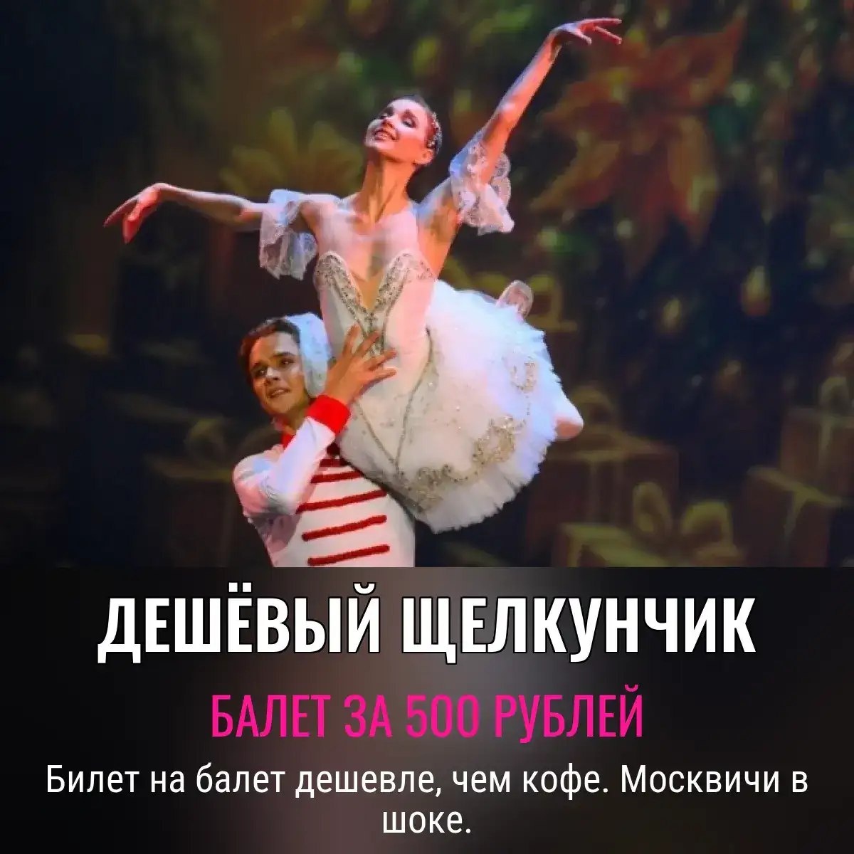 Любители балета, приготовьте валерьянку: Музыкальный театр имени Сац умудрился выставить билеты на легендарного «Щелкунчика» всего за 500 рублей. Для сравнения, в Большом театре поймать билет — всё равно что выиграть в лотерею, только с куда меньшими шансами. 😏 В других театрах столицы тоже не сильно разгуляешься — от 1100 до 3500 рублей, всё для ценителей высокой культуры с низким доходом. Кстати, если хочется почувствовать себя олигархом, очередь в кассу Большого уже выстроилась. У кого денег на кофе нет — добро пожаловать к Сацу. Ненавидишь балет? Просто порадуйся, что где-то в Москве он дешевле шавермы., Следите за новостями 📩