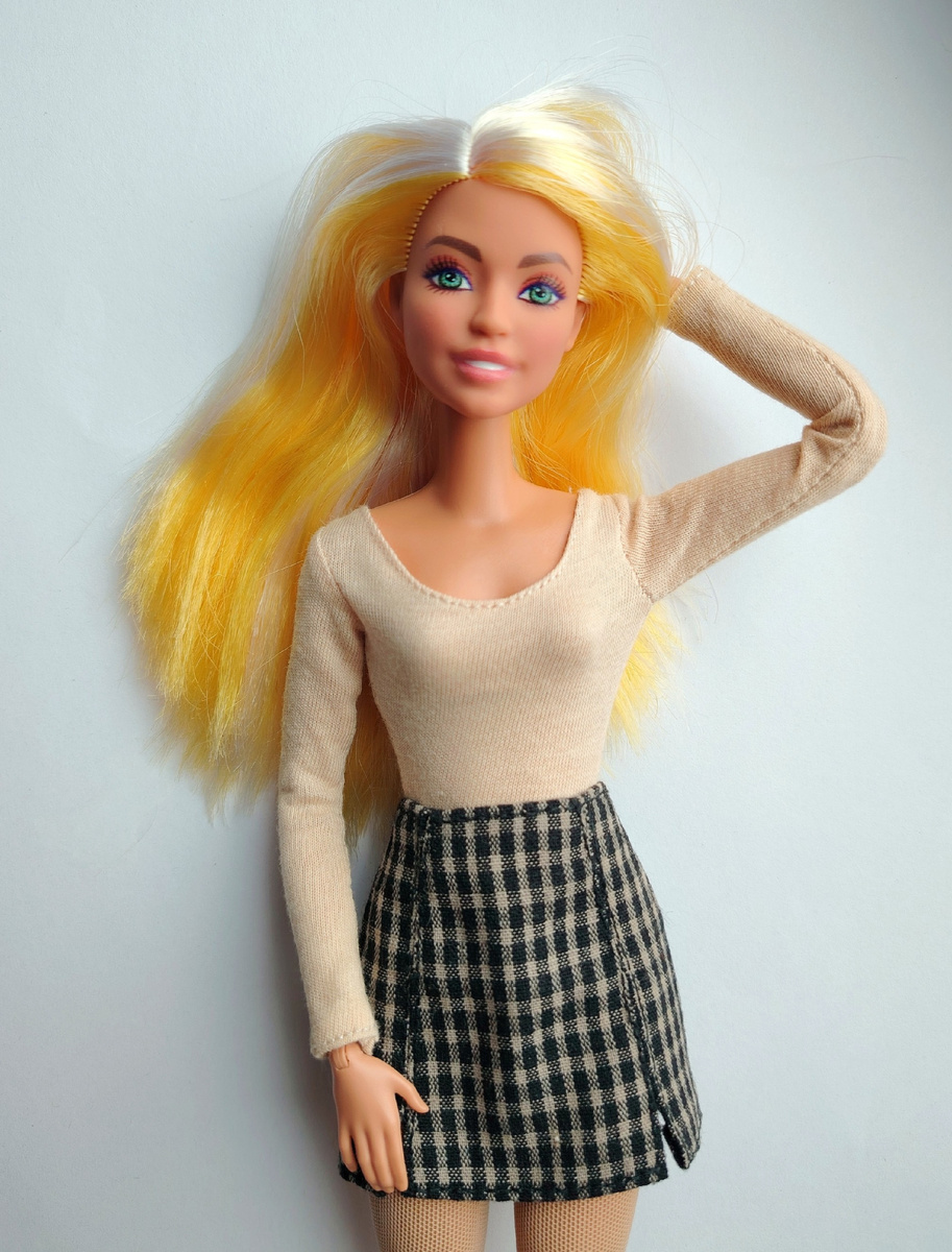 Всем привет👋 Решила я всё-таки хоть как-нибудь сфотографировать мою новую Дайю, очень хочется вам её показать! Потому что многострадальную спину свою я всё ещё лечу. Вот она: Куколка-витаминка, куколка-лучик солнца! Именно то, что нужно для поднятия настроения в пасмурную ноябрьскую хмарь) Не знаю, можно ли назвать эту куколку "Цветновлаской"... Всё же желтый цвет волос - не такой уж и редкий, как вариант блонда. Неудачный вариант, от домашнего неумелого окрашивания😆 Эта Дайя - одна из принцесс Дримтопии, была куплена мной на ВБ в период сентябрьского снижения цен где-то за 700 рублей. Кукла дубовая, в молдированном топе. Впоследствии я пересадила голову Дайи на тело йоги Джойс в зелёном топе. Лицо у куколки пиксельное, но я давно уже смотрю на такое сквозь пальцы. В целом-то девочка очень красивая, позитивная, с интересным макияжем и невероятным цветом глаз! И я обожаю этот молд! Для Дайи мной были сшиты юбка и колготки (из сетки-стрейч). Юбка почему-то "пузырится", явно что