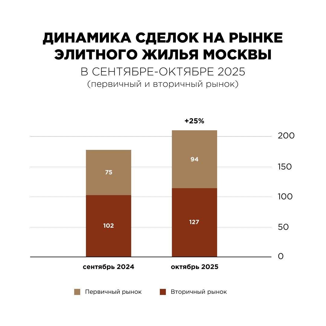Как мы и прогнозировали в сентябрьском обзоре, в октябре рынок элитного жилья Москвы заметно оживился. Количество сделок (первичка + вторичка) во второй месяц осени выросло на 24.8%, достигнув 221 транзакции.