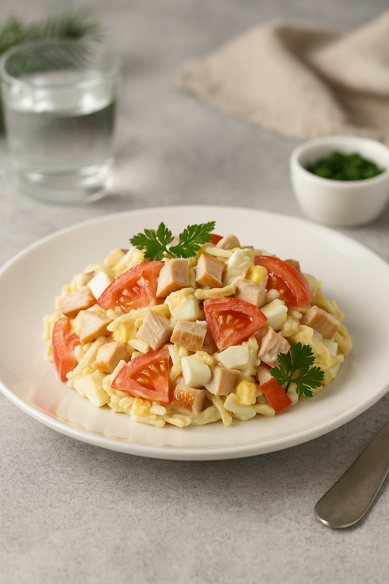 Этот салат с копченой курицей, помидорами и сыром — доказательство того, что вкусное и праздничное блюдо не обязательно должно быть сложным. Главное — качественные продукты и немного внимания к деталям.