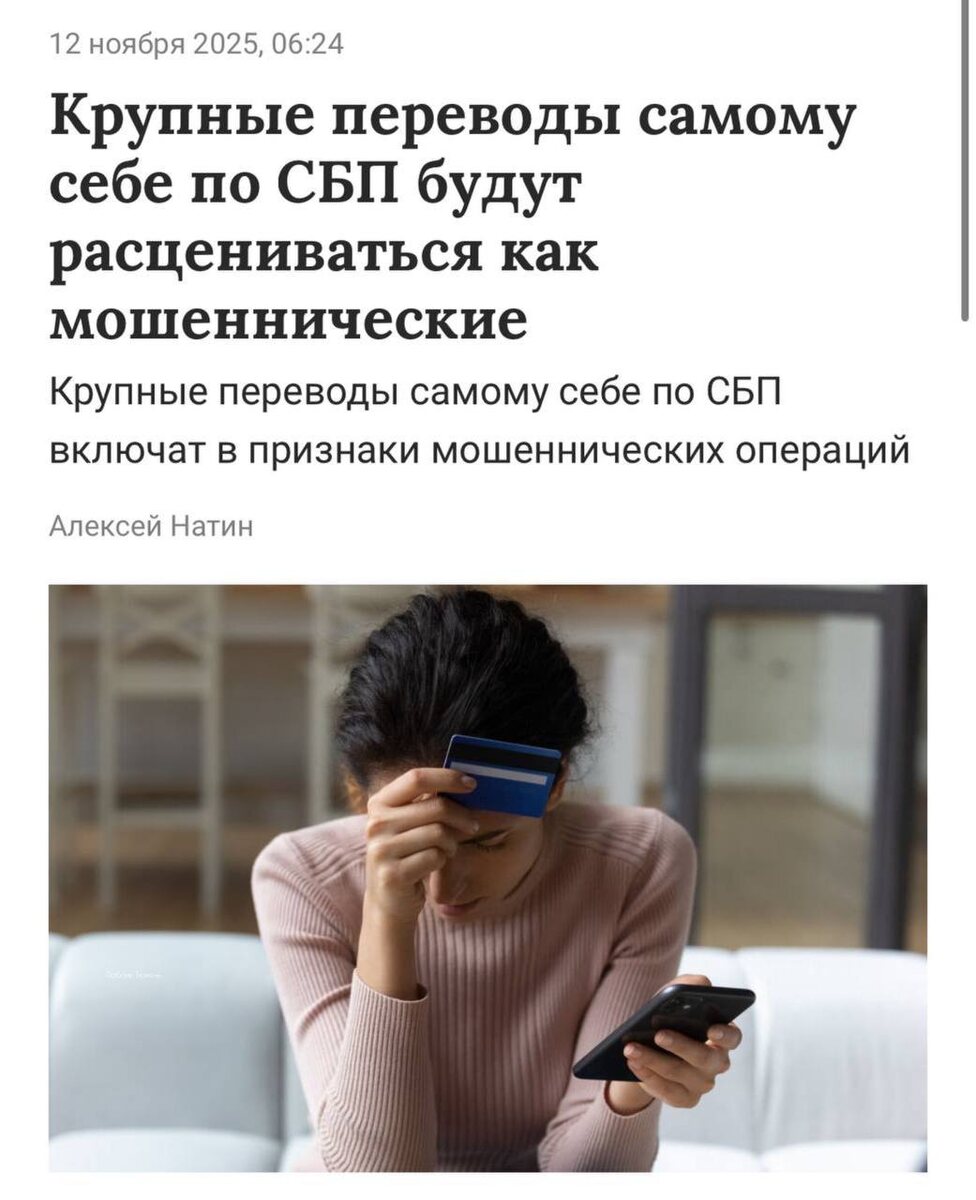 ЦБ приравнял переводы самому себе к признакам мошенничества🤨 Теперь даже привычные операции могут вызвать вопросы. Центробанк РФ объявил о новом подходе в борьбе с мошенниками: крупные переводы самому себе, особенно по СБП, будут включены в список подозрительных признаков. Это связано с тем, что злоумышленники часто убеждают жертв собрать все свои сбережения на одном счете для последующего хищения. В обновленный перечень индикаторов мошенничества также вошли: смена номера для входа в интернет-банк, изменение характеристик телефона и использование «нетипичного» интернет-провайдера.