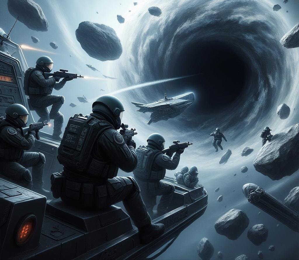 Капитан Алексей Иванов стоял перед экраном навигационной панели корабля «Прометей». Его отряд русского космического спецназа находился глубоко в неизведанных просторах Вселенной, выполняя секретную миссию по исследованию аномалий пространства-времени. Команда состояла из лучших бойцов, прошедших суровую подготовку и закаленных годами службы. — Капитан, показания приборов показывают нестабильность пространственно-временного континуума впереди, — доложил лейтенант Смирнов, сидевший рядом. Иванов нахмурился. Черная дыра была известна своей непредсказуемостью и опасностью. Любой неверный шаг мог привести к гибели всего экипажа. — Продолжаем движение вперед, но готовимся к экстренному маневру, — твердо сказал капитан. «Прометей» медленно продвигался сквозь искривленное пространство, датчики сканировали окружающую среду каждые несколько секунд. Однако внезапно корабль попал в зону гравитационного притяжения черной дыры. Команда мгновенно перешла на боевую готовность. Все понимали, что каждая