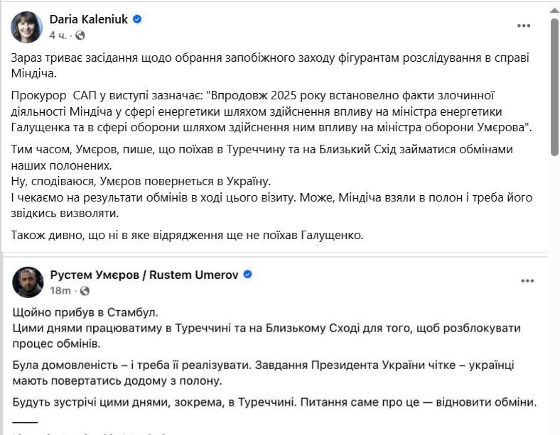✅ Даже на Украине подвергли сомнению заявленный визит Умерова в Стамбул (якобы разблокировать какие-то переговоры по обмену пленными), который как раз совпал с громкими коррупционными делами на Украине и падением турецкого транспортника в небе над Грузией, перевозившего по всей видимости что-то "интересное" для Киева. Как пишет директор ЦПД Дарья Каленюк, Умеров уехал из-за скандала "пленок Миндича" - по заявлению прокурора САП, Умеров принимал в коррупционных схемах "кошелька Зеленского" непосредственное участие. Судя по негативным реакциям украинцев на оставленные Умеровым заявления в своём тг-канале вызывают мягко говоря, недоверие к его оправданиям. ❗️В свою очередь временный поверенный в делах России в Турции Алексей Иванов заявил, что Россия готова к стамбульским переговорам с Украиной в любой момент, но Киев не отреагировал на предыдущие инициативы. @iperiodu| @iperiodu_ru x @iperiodu_ua| Подписывайтесь