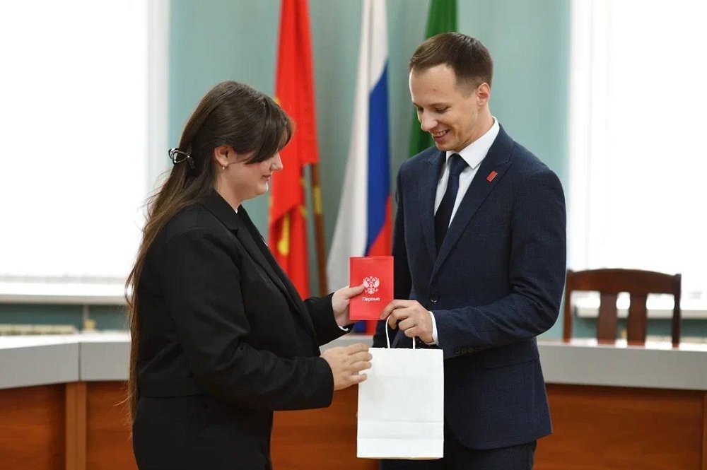 В мэрии столицы Адыгеи прошла церемония вручения паспортов школьникам, которые проявили себя в учебной, спортивной, культурной и волонтерской деятельности. В рамках федеральной программы Движения Первых «Мы — граждане России» самый важный документ получили 20 майкопчан. Мероприятие прошло при поддержке городского Отдела молодежной политики. Руководитель структурного подразделения Егор Сергеев поздравил ребят с важным событием и пожелал им быть достойными звания «гражданин России». Фото: Пресс-служба администрации Майкопа