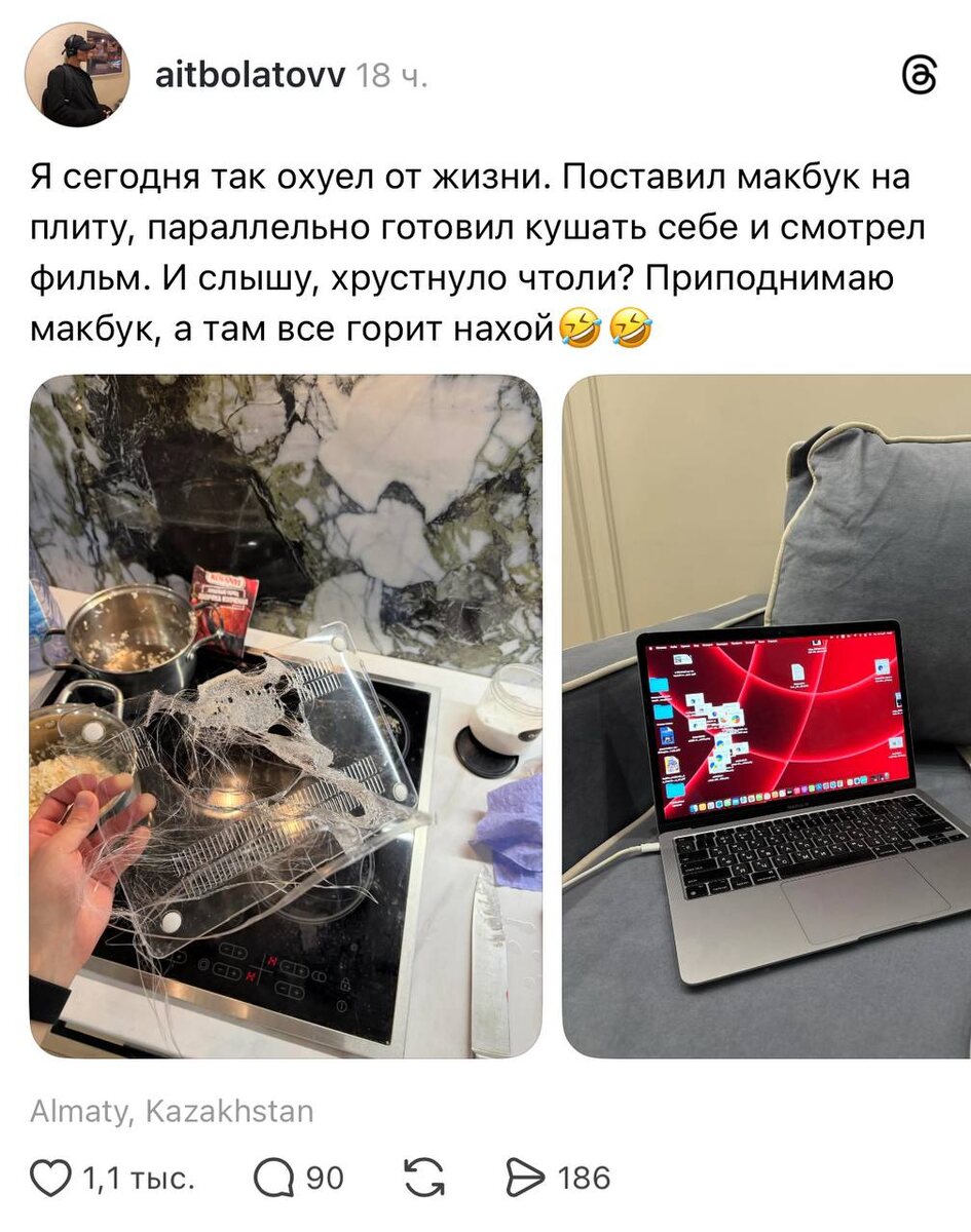 Человек поставил макбук на плиту — одновременно готовил и смотрел фильм. Понял, что что-то не так, только когда что-то начало трещать. Благодаря чехлу ноутбука он выжил и продолжает работать нормально. Наверное, лучше было бы использовать духовку. Бесплатный GPT-bot ⚡️НейроМастер⚡️