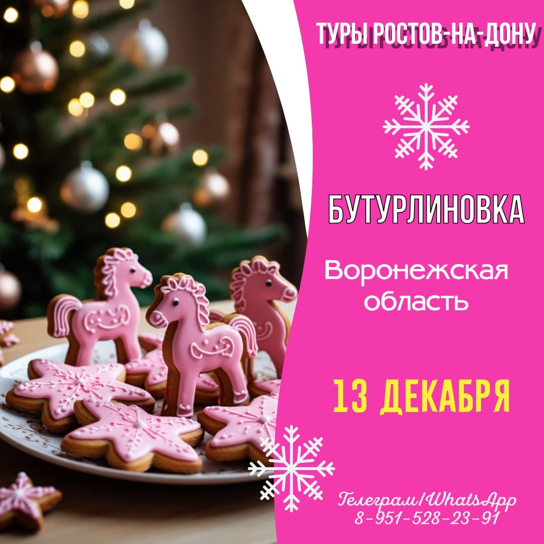 ❄️❄️❄️❄️В преддверии ❄️❄️❄️❄️новогоднего ❄️❄️❄️❄️праздника ❄️❄️❄️❄️приглашаем вас окунуться в атмосферу русских традиций и весёлого праздника! ♥️♥️♥️♥️♥️♥️♥️♥️♥️♥️♥️♥️ ♥️Мы побываем на старейшем молочном заводе Воронежской области, дегустации продукции; ♥️Нас ждёт экскурсия по музейному комплексу «Лесная школа» в Шиповом лесу; ♥️прогулка по исторической части города Бутурлиновка; ♥️посещение кафедрального Спасо – Преображенского собора; ♥️заедем в фирменный магазин, где под заказ можно купить сувенир «Поросенок с салом»; ♥️эксклюзивный мастер-класс по росписи традиционного вырубного розового пряника. 🪖 Дата тура: 13 декабря 🪖 Стоимость: 5000Р/чел. ПРОГРАММА ♥️ ЗДЕСЬ ➖➖➖➖➖➖➖➖ 🌲🌲🌲🌲🌲 Бронирование:♥️ 🌲🌲🌲🌲🌲 WhatsApp/ 🌲🌲🌲🌲🌲 Телеграм: 🌲🌲🌲🌲🌲8-951-528-23-91 Мы в MAX: https://max.ru/tripRND