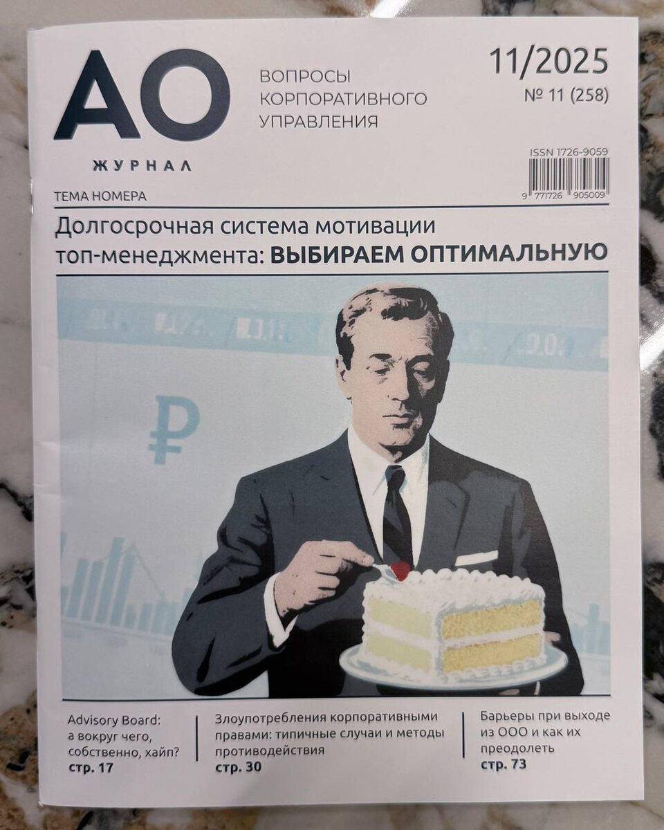 Вчера получила свой авторский экземпляр журнала «Акционерное общество». В ноябрьском номере вышла моя статья — десяток страниц размышления о новых разъяснениях Верховного суда по взысканию убытков с директоров, если их действия или решения были одобрены высшими органами управления. Тема, на мой взгляд, крайне важная, потому что напрямую касается баланса ответственности и корпоративного одобрения — того самого тонкого рубежа между личным риском директора и коллективным решением компании. Статью уже можно прочитать в журнале — она доступна юристам по всей стране. А еще — приятный для меня сюрприз — на первом развороте номера я увидела нашу с Ильей фотографию. В этом году мы запустили пробную версию награды в области корпоративного права — маленький, но значимый эксперимент для профессионального сообщества. Решили проверить, можно ли с помощью открытого, «народного» голосования определить тех, кто действительно влияет на развитие корпоративного права. Первый раз, признаюсь, сделали всё