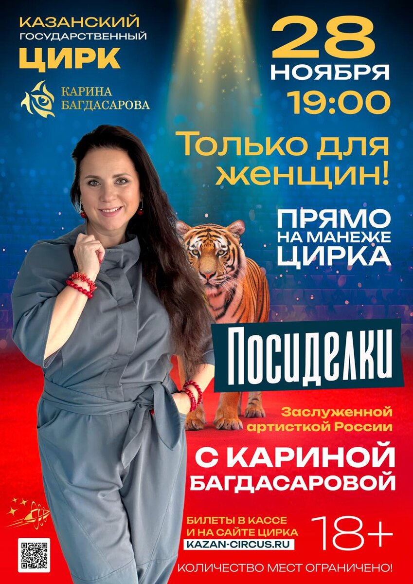 «Посиделки с Кариной Багдасаровой» Заслуженная артистка России, потомственная дрессировщица, режиссёр, продюсер, экологический историк и мотивационный спикер Карина Багдасарова приглашает женщин на творческую встречу, чтобы поговорить о том, как ✨ Посмотреть в глаза своему внутреннему «тигру», ✨Отдрессировать свой страх, ✨Справиться с трудностями, ✨Разрешить себе радоваться. Вы уютно расположитесь прямо на манеже цирка. Это будет откровенный разговор и живое общение в тёплом женском кругу – вдохновляющий вечер без каблуков и… условностей. 🕕 28 ноября в 19:00 📍 Казанский цирк 🎫 Билеты по ссылке