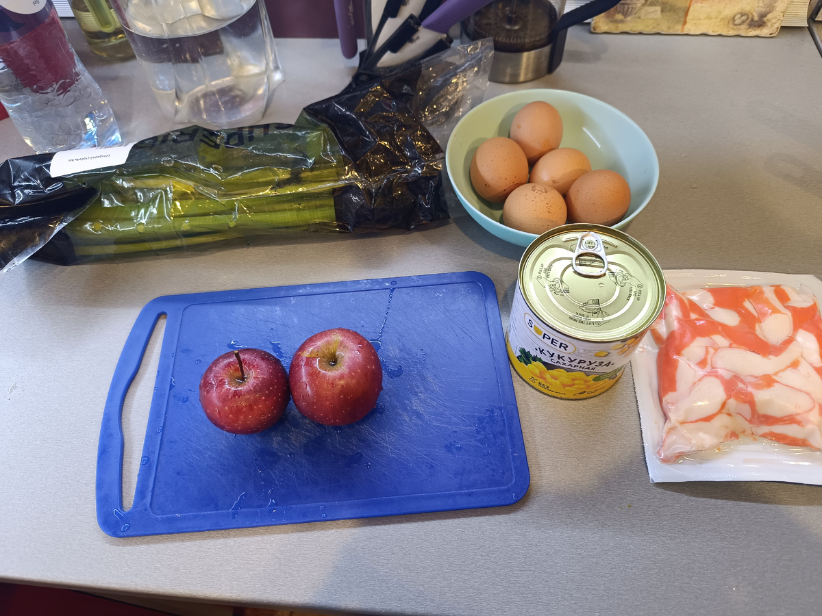 Предлагаю вашему вниманию очень вкусный салат из простых и доступных ингредиентов- салат со стеблем сельдерея. Как таковой пропорции ингредиентов нет, поэтому всё приблезительно. - стебли сельдерея (упаковка) - кукуруза консервированная 1 банка - крабовое мясо 1 упаковка - 2-3 варёных яйца - 1-2 яблока, лучше зелёных с кислинкой - зелень, укроп - сметана - майонез