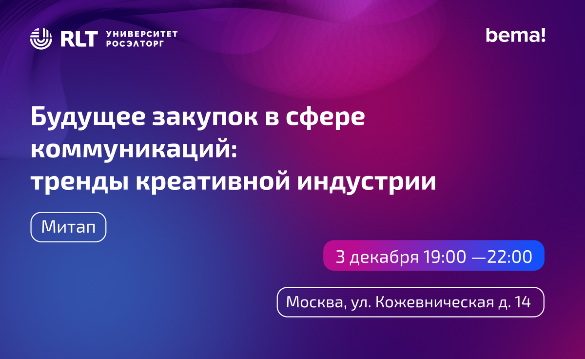3 декабря в Москве Росэлторг.Университет совместно с организаторами премии индустрии событийного маркетинга и интегрированных коммуникаций bema! проведёт митап, посвящённый закупкам в креативной сфере. К участию в мероприятии приглашаются менеджеры по закупкам и развитию бизнеса в креативной индустрии, руководители и специалисты event-агентств. На встрече эксперты обсудят ключевые проблемы и вызовы в сфере креативных закупок, а также определят объективные критерии для оценки поставщиков и разработают индустриальные стандарты. Цель — обменяться опытом и совместными усилиями создать практические стратегии для улучшения процесса креативных закупок. Узнать подробную информацию и зарегистрироваться можно на сайте Росэлторг.Университета.