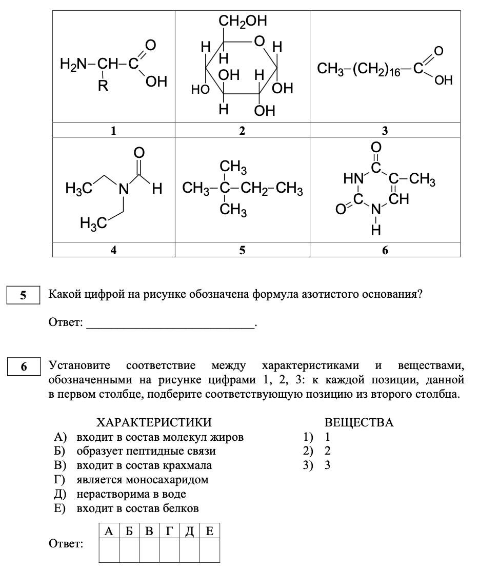 Интересное задание попало в демоверсию. Ничего страшного, просто нужно уметь определять тип вещества по структурной формуле! Не конкретное вещество, а лишь тип! То есть уметь отличать аминокислоту от глюкозы, например. Из интересного — азотистое основание под цифрой 6 ✋ 1 — аминокислота 2 — глюкоза 3 — жирная кислота 4 — отвлекающий фактор, не нужный для задания (какой-то формамид) 5 — отвлекающий фактор, не нужный для задания (какой-то алкан) 6 — азотистое основание То есть 4 и 5 здесь вообще не нужно определить, это просто дистракторы = чтобы сбить с толку