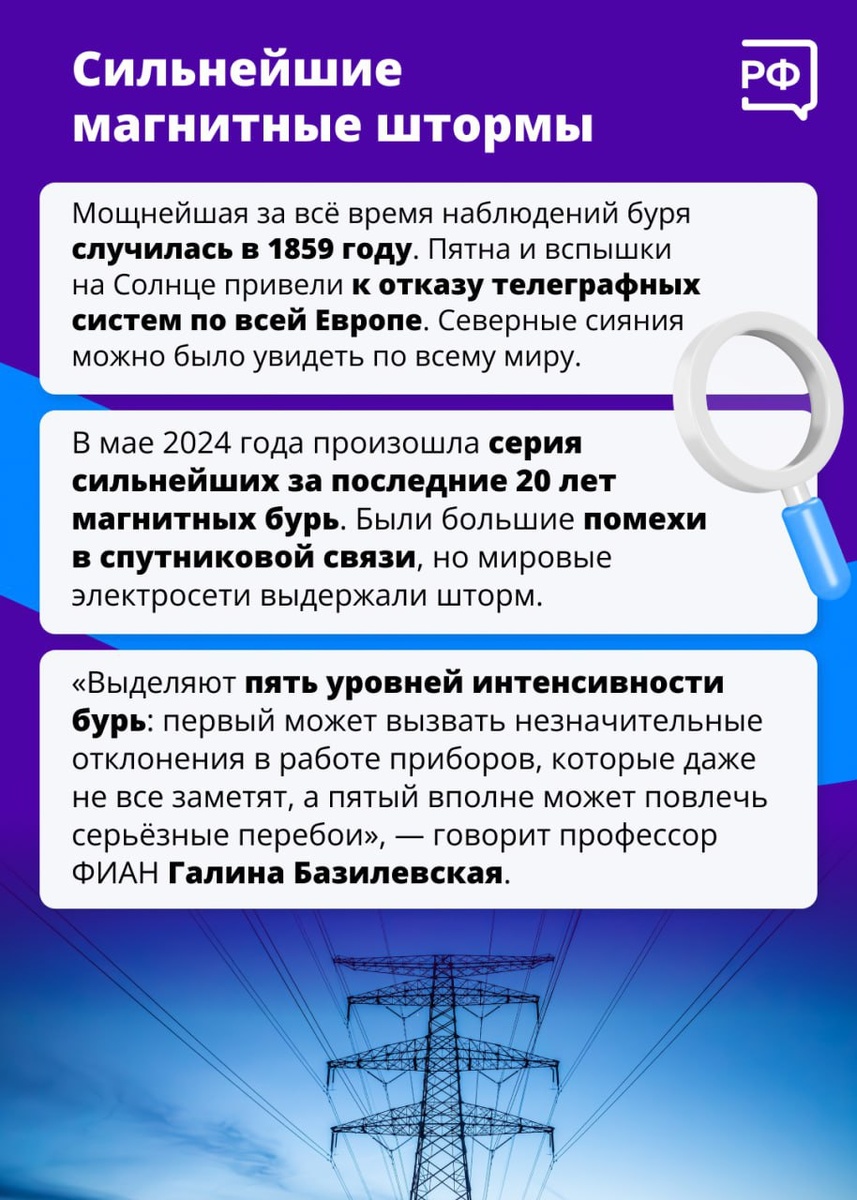 Геомагнитные возмущения дошли почти до максимального уровня G5. Когда магнитное поле успокоится - пока точно неизвестно. По данным учёных, такое сильное явление связано с тремя сильными вспышками на Солнце. Специалисты надеются, что в ближайшие сутки ситуация стабилизируется. О сильнейших магнитных бурях и как переживать это явление метеозависимым - узнайте в карточках. Фото: Объясняем. РФ