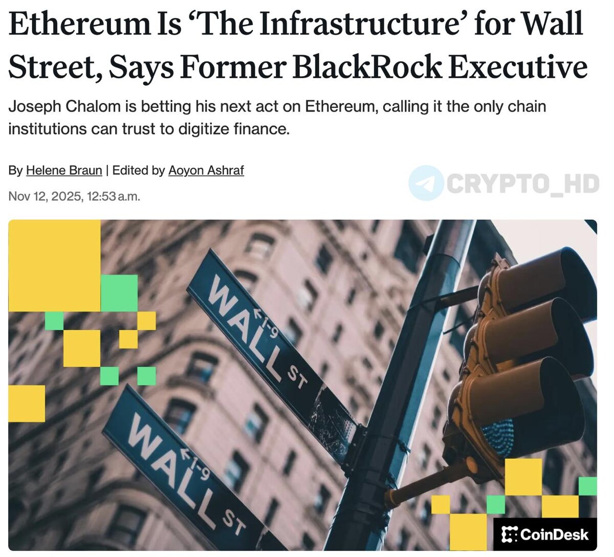 #eth 🧐 Бывший ТОП из BlackRock: Ethereum – инфраструктура Уолл-стрит. Джозеф Чалом, экс-глава направления цифровых активов BlackRock и теперь CEO SharpLink, заявил, что Ethereum – единственная сеть, которой могут доверять институционалы. ▪ Почему именно ETH? В Ethereum сочетаются доверие, безопасность и ликвидность – три ключевых критерия Уолл-стрит. Ethereum уже сегодня содержит большинство стейблкоинов, токенизированных активов и активных смарт-контрактов. ▪ ETH как «продуктивный актив». В отличие от Биткоина, который просто лежит в портфелях, ETH генерирует доходность ~3% годовых через стейкинг. В SharpLink застейкали более $3b в ETH и тестируют стратегии рестейкинга вместе с Consensys, Linea и EigenLayer. «Со временем мы перестанем различать DeFi и TradFi – останутся просто “финансы”. И фундаментом этих финансов станет Ethereum». Ранее: - драйверы суперцикла - выбор Уолл-стрит Crypto Headlines