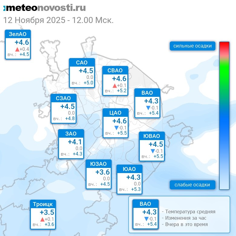 В 12:00 в Москве было от +3.3°C до +5°C, средняя температура +4.4°C #погода #Москва #осень #температура #12ноября #среда