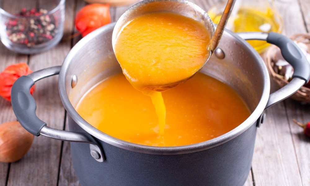 - Добавьте кипятка до исходного объёма (1 литр). Суп должен получиться не густым, но и не водянистым – как лёгкое пюре.