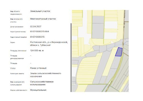 Название: право заключения договора купли-продажи земельного участка, находящего в собственности МО "Тубянское сельское поселение", из земель сельскохозяйственного назначения с кадастровым номером 61:07:0600015:664, площадью 124000кв.м, местоположение: Ростовская область, Верхнедонской район,вблизи х.Тубянский, вид разрешенного использования - для сельскохозяйственного использования Канал: Госземля Ростовская область Область: обл Ростовская Район: м.р-н Верхнедонской Населенный пункт: с.п. Тубянское вблизи х.Тубянский Локация: Смотреть на карте ВРИ: Сельскохозяйственное использование Кадастровый номер: 61:07:0600015:664 Кадастровая стоимость: - Вид сделки: Продажа Площадь: 124000 м² Начальная цена: 697000.00 руб. Дата завершения: 20.11.2025 Подробнее: ГИС ТОРГИ #госземля #земляотгосударства #земля #земельныйучасток #земельныеторги #торги #аукцион #продажаземли #продажа #ростовскаяобласть