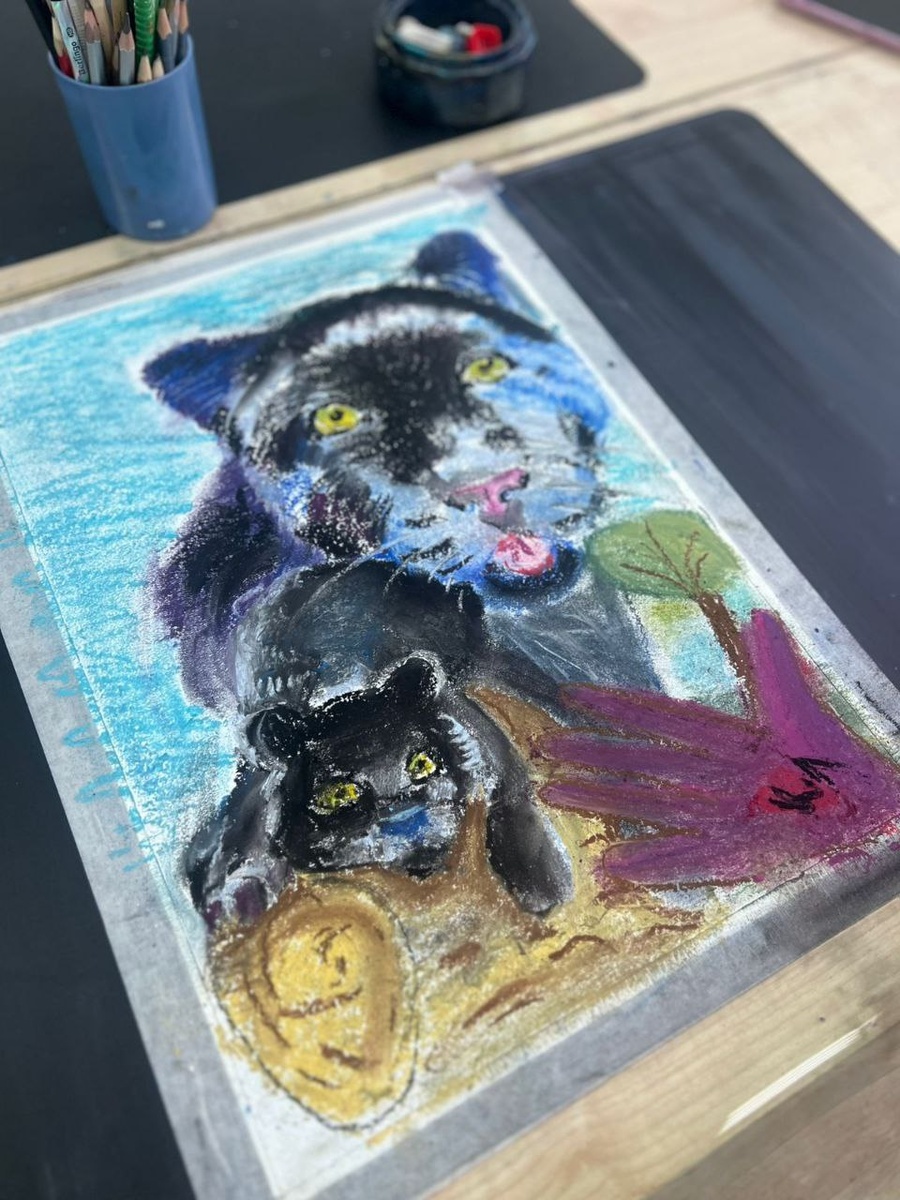 🎨 Пастель. Материал, который не про точность, а про ощущение. Она не любит спешки и не терпит контроля. Стоит чуть сильнее нажать — и цвет рассыпается в пыль. Чуть мягче — и он ложится, как дыхание. Узнали о каком материале речь? Да, пастель не про идеальность 🩵 Она про смелость прикосновения, про мягкость, которую можно ощутить пальцами. И про то, как из пыли рождается свет. На рисунке — «Пантера»: пластичная, тихая, будто нарисована не рукой, а кожей. Написала её наша ученица, Катя, 7 лет 🖤 Иногда кажется, что рисует не человек — а сама пастель решает, где быть теням, где — шёпоту цвета. Присоединяйтесь к нам, 🖤 Арт-студия «Смарт» 🗓 Актуальное расписание - смотри 👉 studiasmart.ru 👉
