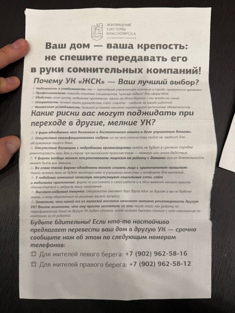 УК «ЖСК» просит жильцов домов не уходить от них к другим компаниям На приём к депутату ЛДПР Ивану Петрову красноярцы принесли платёжки от УК «ЖСК», где на обратной стороне ЖСК просит верить только им и не уходить в другие управляющие компании. Это народный избранник назвал классическим психологическим приёмом, основанным на страхе перед новизной: у нас всё плохо, но мы уже вроде как свои, родные, а у других будет еще хуже. Иван Петров прочитал «Почему УК «ЖСК» — Ваш лучший выбор?» и, конечно, прокомментировал это: 1️⃣ Надежность и стабильность: мы - крупнейшая управляющая компания в городе, проверенная временем. Только мы-то знаем, что надёжно и стабильно ЖСК может лишь давать отписки на обращения жителей, нагло обманывать руководство города и забивать на исполнение прямых обязательств. Крупнейшая компания — это правда. Только и крупнейшая компания по потере домов за несколько лет, и это всё проверено временем. 2️⃣ Профессионализм: команда опытных специалистов, «кузница кадров» дл