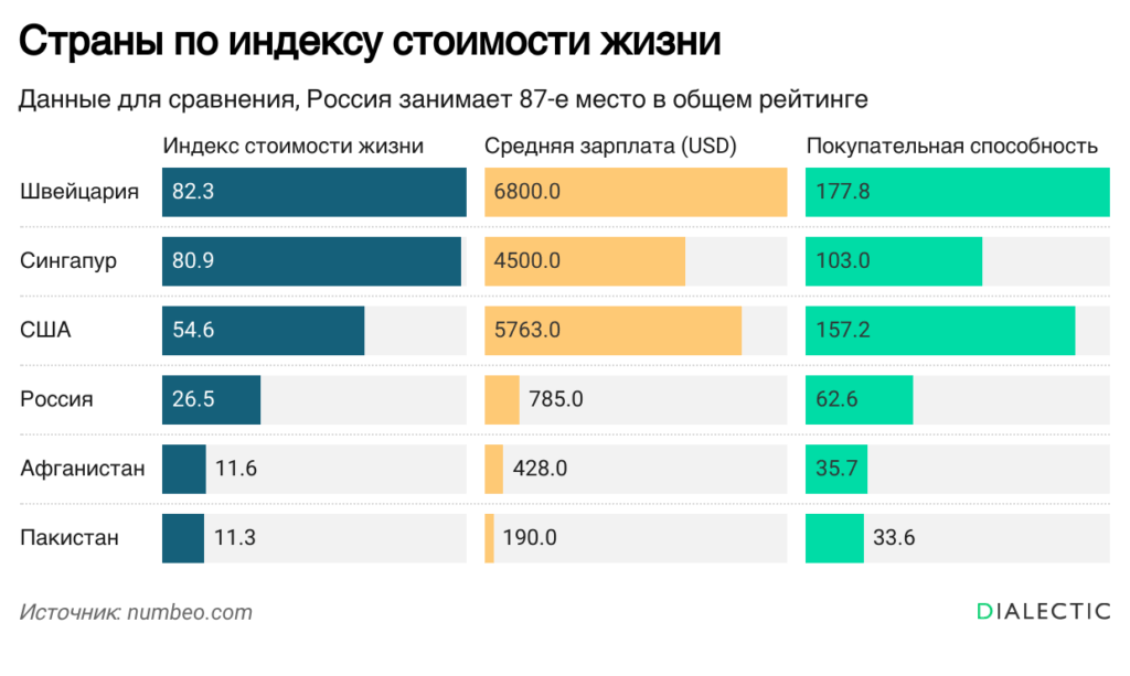 Россия заняла 87-е место в глобальном рейтинге стоимости жизни и аренды жилья с показателем 26,5 по шкале Cost of Living Plus Rent Index (Нью-Йорк = 100), что делает жизнь в стране на 73,5% дешевле, чем в Нью-Йорке. США. Об этом говорится в обновлённом индексе за середину 2025 года. Согласно данным портала, местная покупательная способность в России равна 62,6 — на 37,4% ниже, чем в Нью-Йорке. При этом жизнь в России значительно дешевле, чем в Швейцарии (индекс 82,3, зарплата около 6800 USD, покупательная способность 177,8) или Сингапуре (80,9, около 4500 USD, покупательная способность 103,0), но дороже, чем в Пакистане (11,3, около 190 USD, покупательная способность 33,6) и Афганистане (11,6, около 428 USD, покупательная способность 35,7). В США стоимость жизни на 47,6% выше российской, при средней зарплате 5763 доллара и покупательной способности 157,2. Numbeo рассчитывает индексы относительно Нью-Йорка, учитывая цены на продукты, транспорт, аренду, рестораны и коммунальные услуги. С