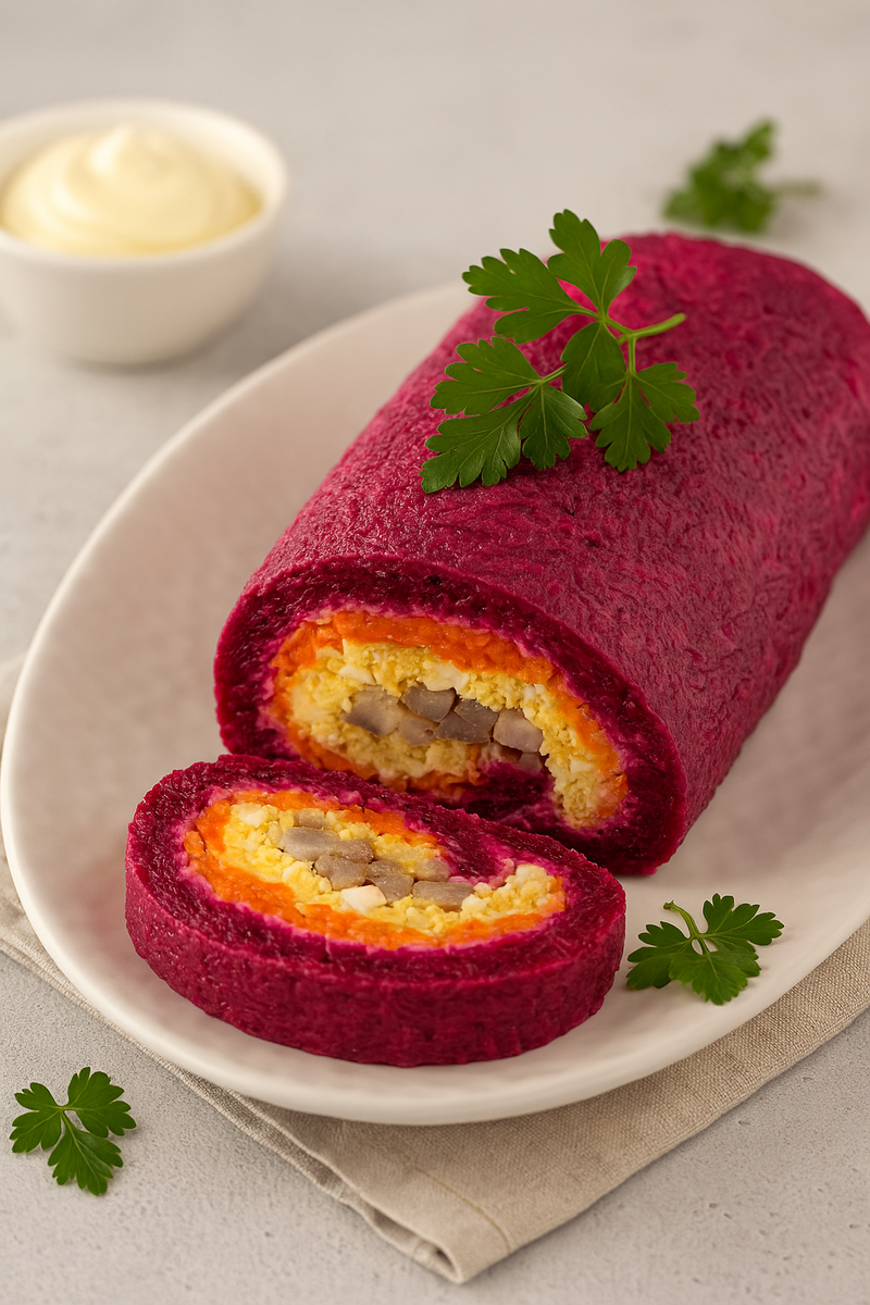 Если классическая «Селёдка под шубой» уже кажется слишком привычной, попробуйте этот вариант — рулет «Шуба» со скумбрией. Это не просто салат, а эффектное блюдо для новогоднего стола, которое удивит даже тех, кто пробовал всё. Я поделюсь пошаговым рецептом, расскажу, как свернуть рулет аккуратно и сохранить его форму, и раскрою все нюансы, чтобы вкус получился насыщенным, а подача — ресторанного уровня.