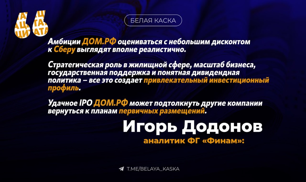 🪖 IPO ДОМ.РФ как луч света в царстве фондовой стагнации ©️ Игорь Додонов, аналитик ФГ «Финам»: Российский рынок IPO переживает настоящую засуху. Индекс Мосбиржи теряет 12% с начала года, а специализированный индекс новых размещений обвалился на 17%. В этих условиях планируемое IPO ДОМ.РФ выглядит как попытка реанимировать замерший сегмент первичных размещений. Цели компании понятны – привлечь 15-30 млрд рублей для развития жилищных проектов и поддержать отечественный фондовый рынок. Руководство мудро оставило себе возможность отступления: при неблагоприятной конъюнктуре размещение может быть отложено. Амбиции ДОМ.РФ оцениваться с небольшим дисконтом к Сберу выглядят вполне реалистично. Стратегическая роль в жилищной сфере, масштаб бизнеса, государственная поддержка и понятная дивидендная политика – все это создает привлекательный инвестиционный профиль. Критерии успеха размещения будут разными для всех участников. Для эмитента успех – это выход на верхнюю границу диапазона в 30 м