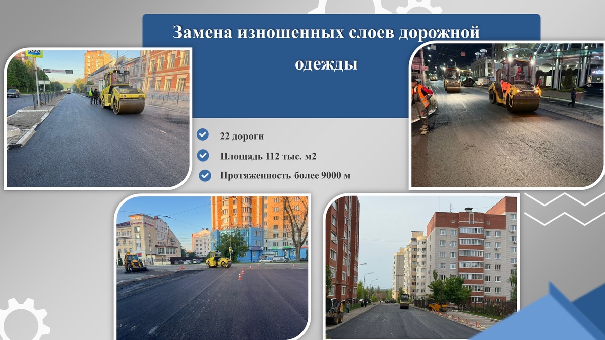 Провели замену изношенных слоев дорожной одежды на улицах с высокой транспортной нагрузкой: Гагарина, Королева, Ленина, Телевизионная, Труда, Пушкина, маршала Жукова и других. А также там, где поступило большое количество обращений жителей: на Поле Свободы, Кибальчича, Болотникова.